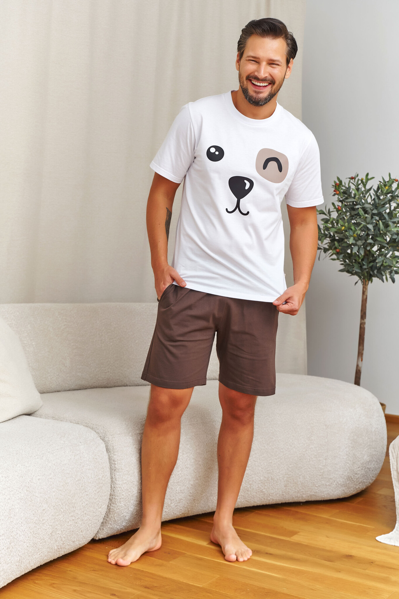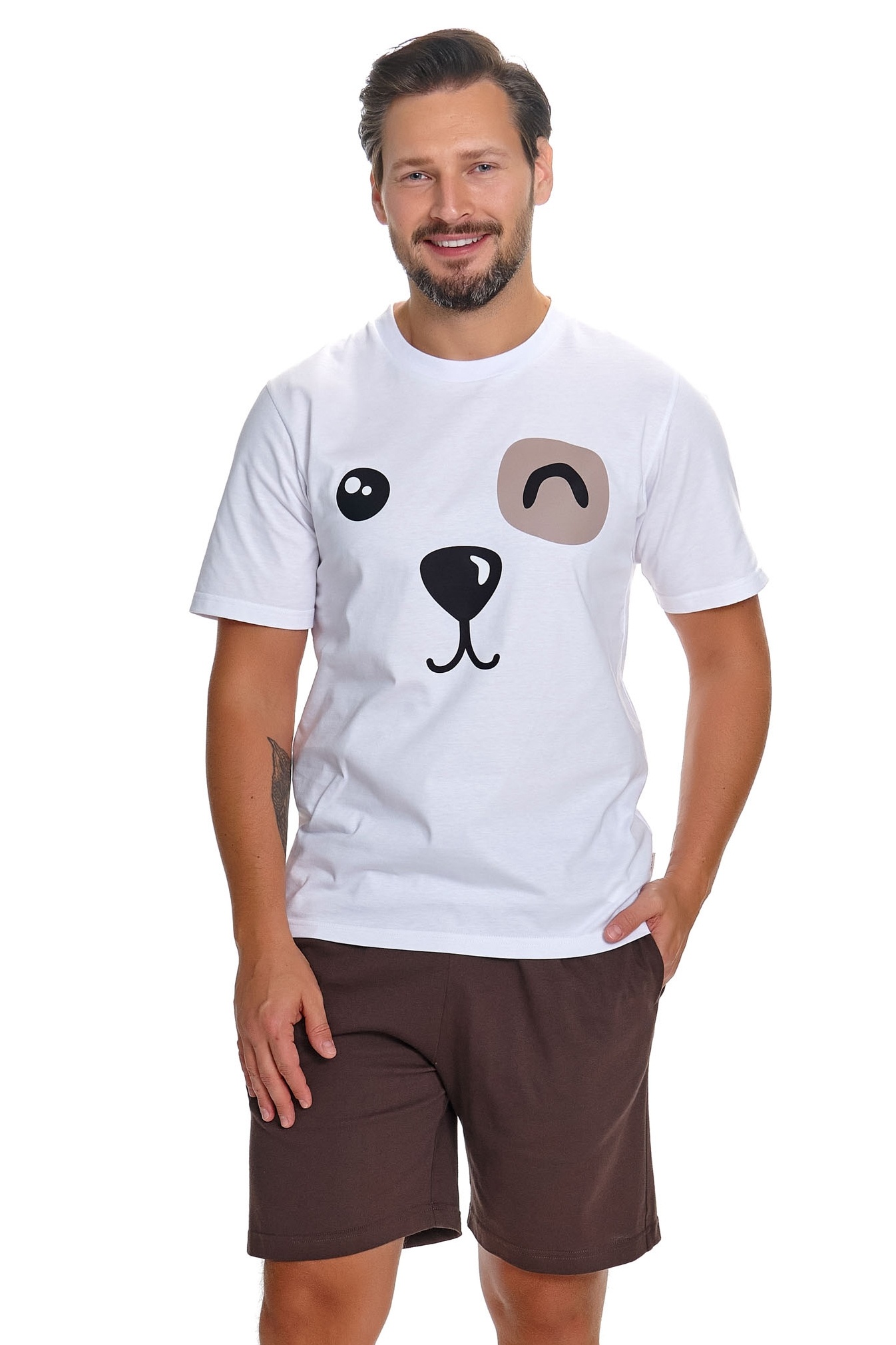 Katoenen pyjama heren met korte mouw en shorts – speelse hondenprint voor een comfortabele nacht en stijlvol homewear.