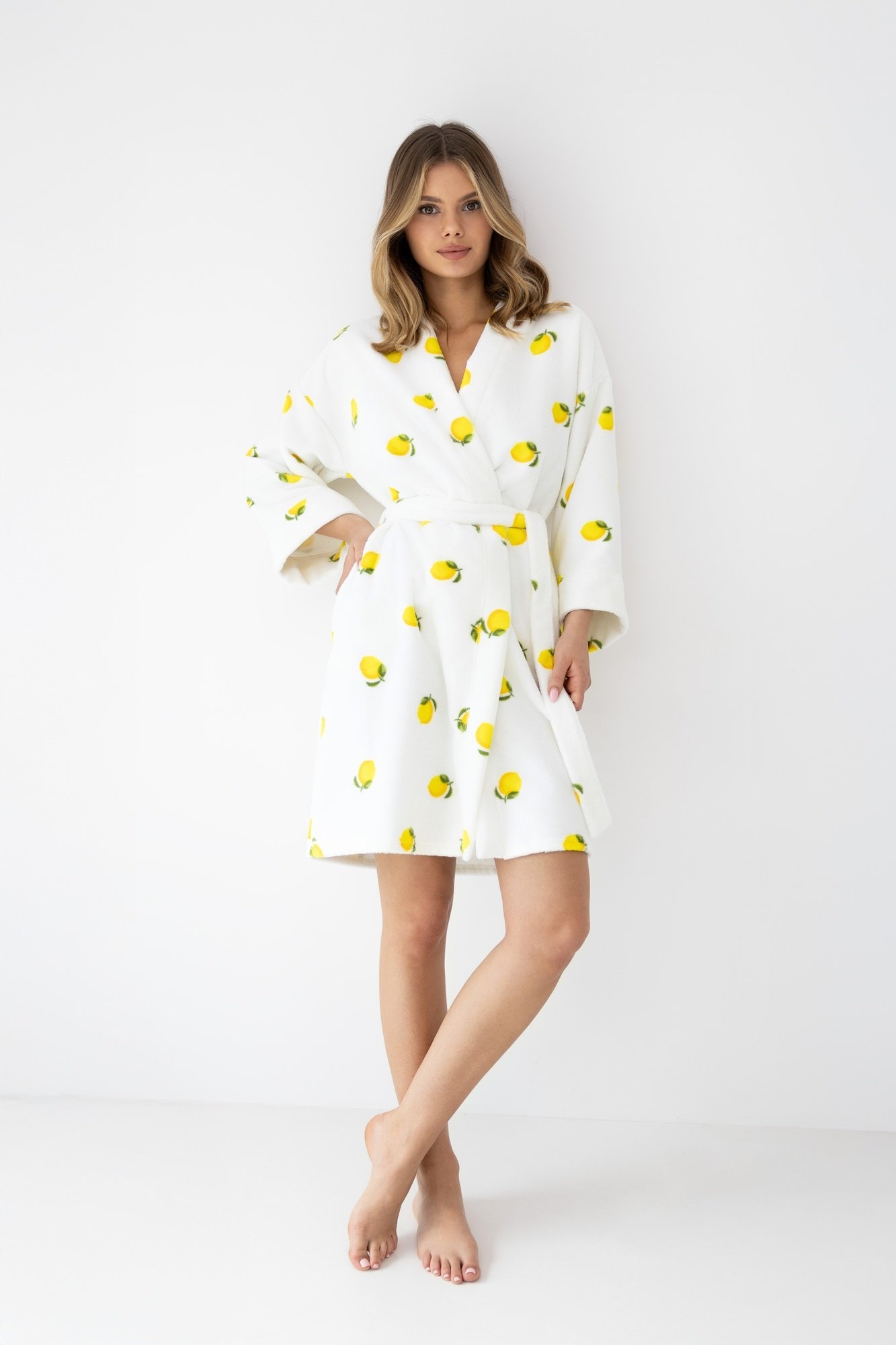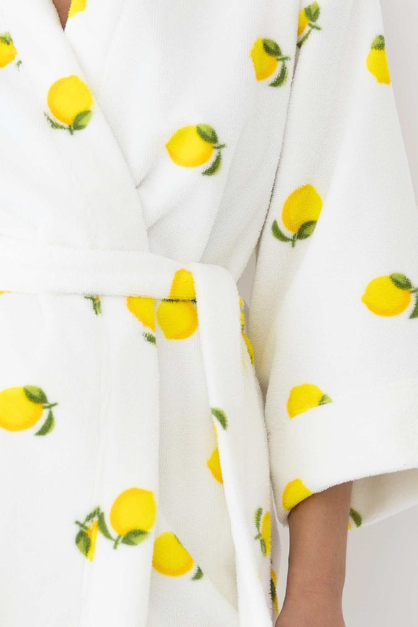 Vrolijke badstof badjas met opvallend citroenenprint en strikceintuur – een zonnige start van elke ochtend.