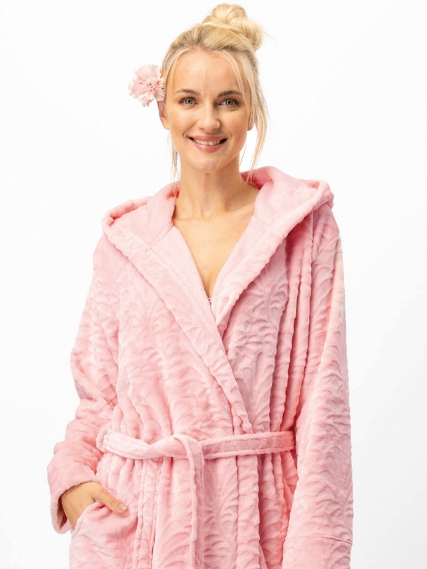 Deze elegante dames badjas tot halverwege de kuit is gemaakt van extra zachte Velvet Super Soft stof. Het subtiele bloemmotief geeft de badjas een stijlvolle uitstraling, terwijl de praktische details zorgen voor optimaal draagcomfort. De diepe capuchon, brede ceintuur en ruime zijzakken maken dit model functioneel en comfortabel. Dankzij de omslagmanchetten kun je de mouwen eenvoudig oprollen, ideaal voor dagelijks gebruik. De zachte roze tint maakt de badjas geschikt voor elk seizoen en een prachtig cadeau voor een dierbare.