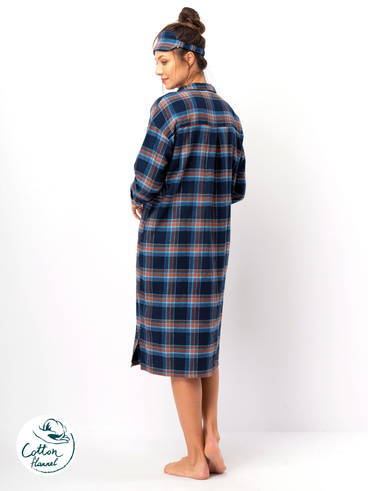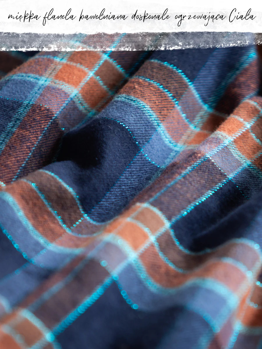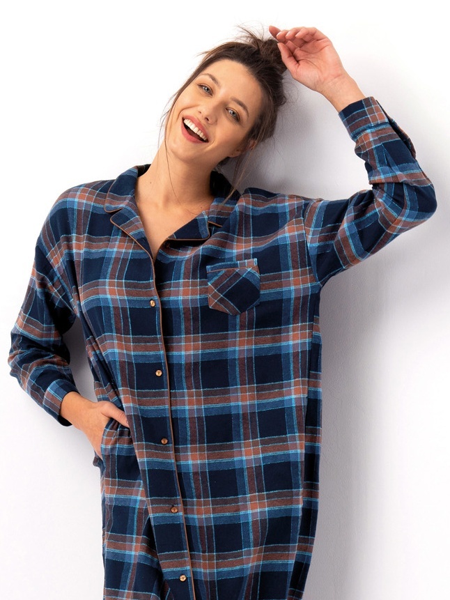 Deze dames pyjama van zachte flanel is ideaal voor koude herfst- en winternachten. Het klassieke model combineert een losvallende blouse in diep marineblauw met subtiele glansdraad en een comfortabele lange broek in bruin. De blouse heeft een doorlopende knoopsluiting, kraag en verlaagde schouderlijn voor extra bewegingsvrijheid. De lange broek met rechte pijpen, elastische tailleband en zakken biedt optimaal draagcomfort. Perfect voor vrouwen die waarde hechten aan warmte, stijl en functionaliteit. Ook zeer geschikt als cadeau.