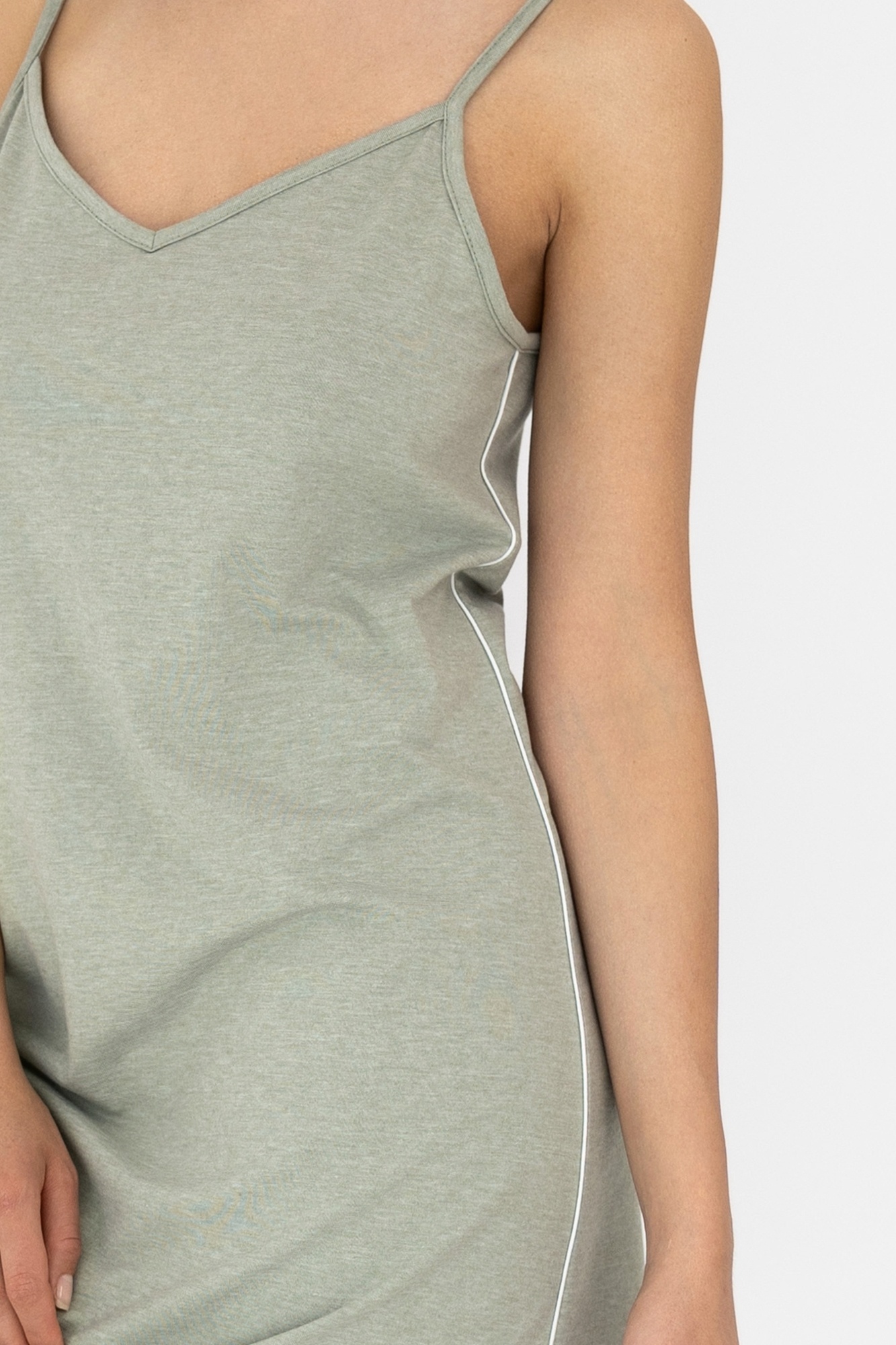 Zacht nachthemd met spaghettibandjes, V-hals en sierlijke witte bies — luchtig, vrouwelijk en gemaakt in de EU.
