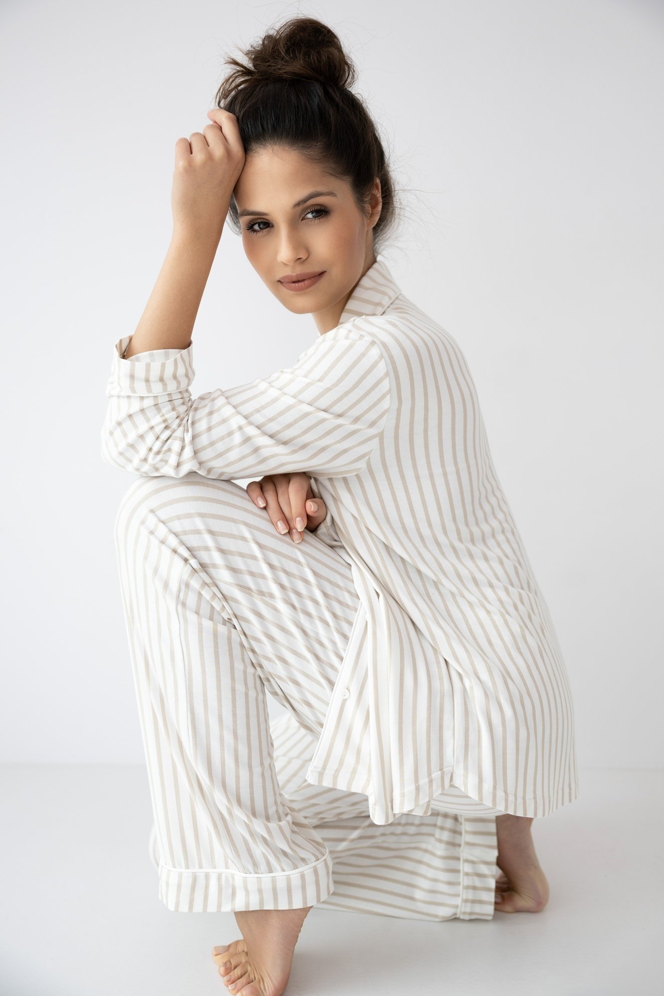 De Sensis Amani pyjama is een stijlvolle en comfortabele dames pyjamaset met lange broek in een elegante streepprint. De set bestaat uit een klassiek pyjamashirt met knoopsluiting en een lange broek met een rechte, ontspannen pasvorm.