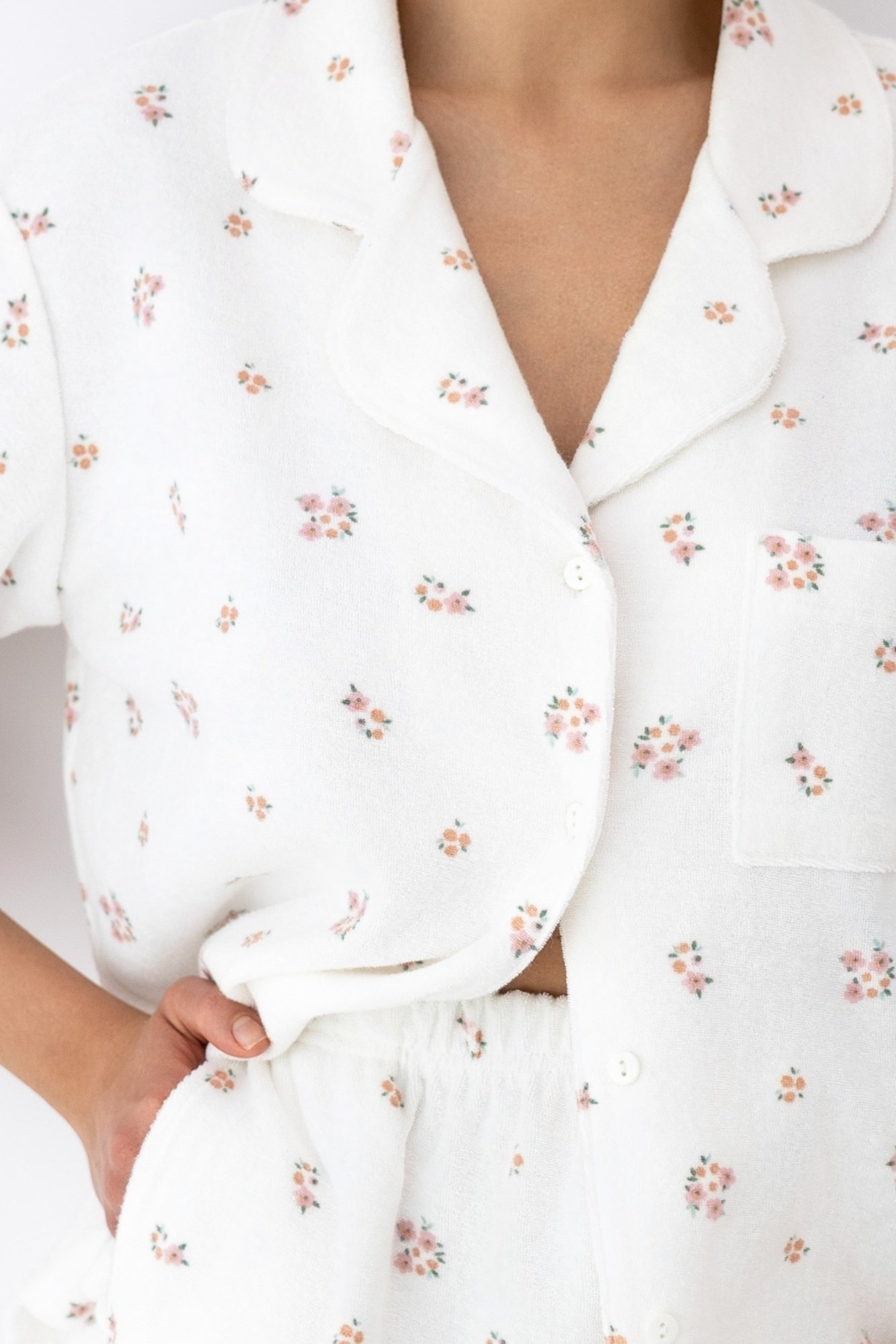 Zachte katoenen shortama in luchtige badstof met reverskraag, knoopsluiting en vrolijke bloemenprint – comfort voor warme zomernachten.