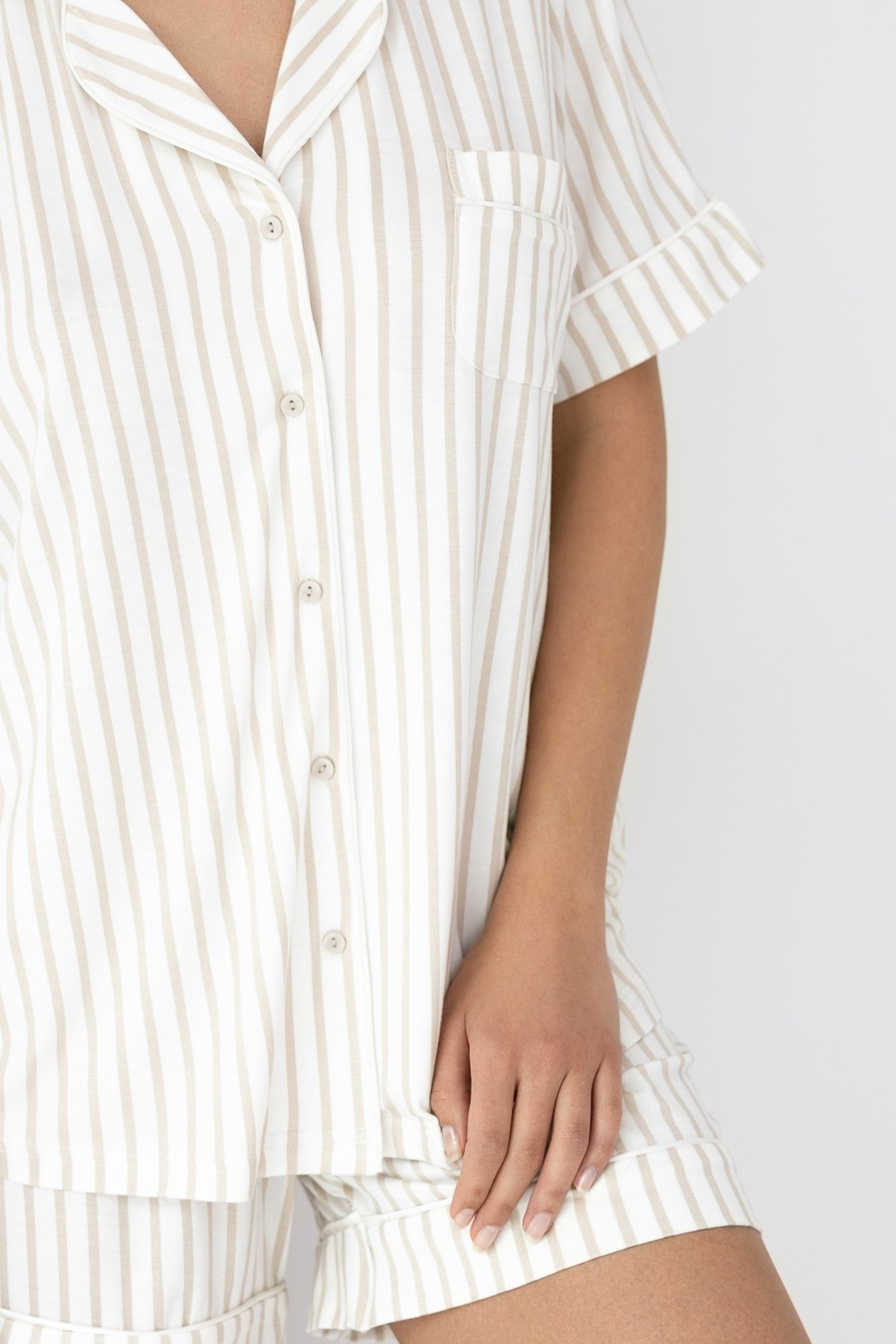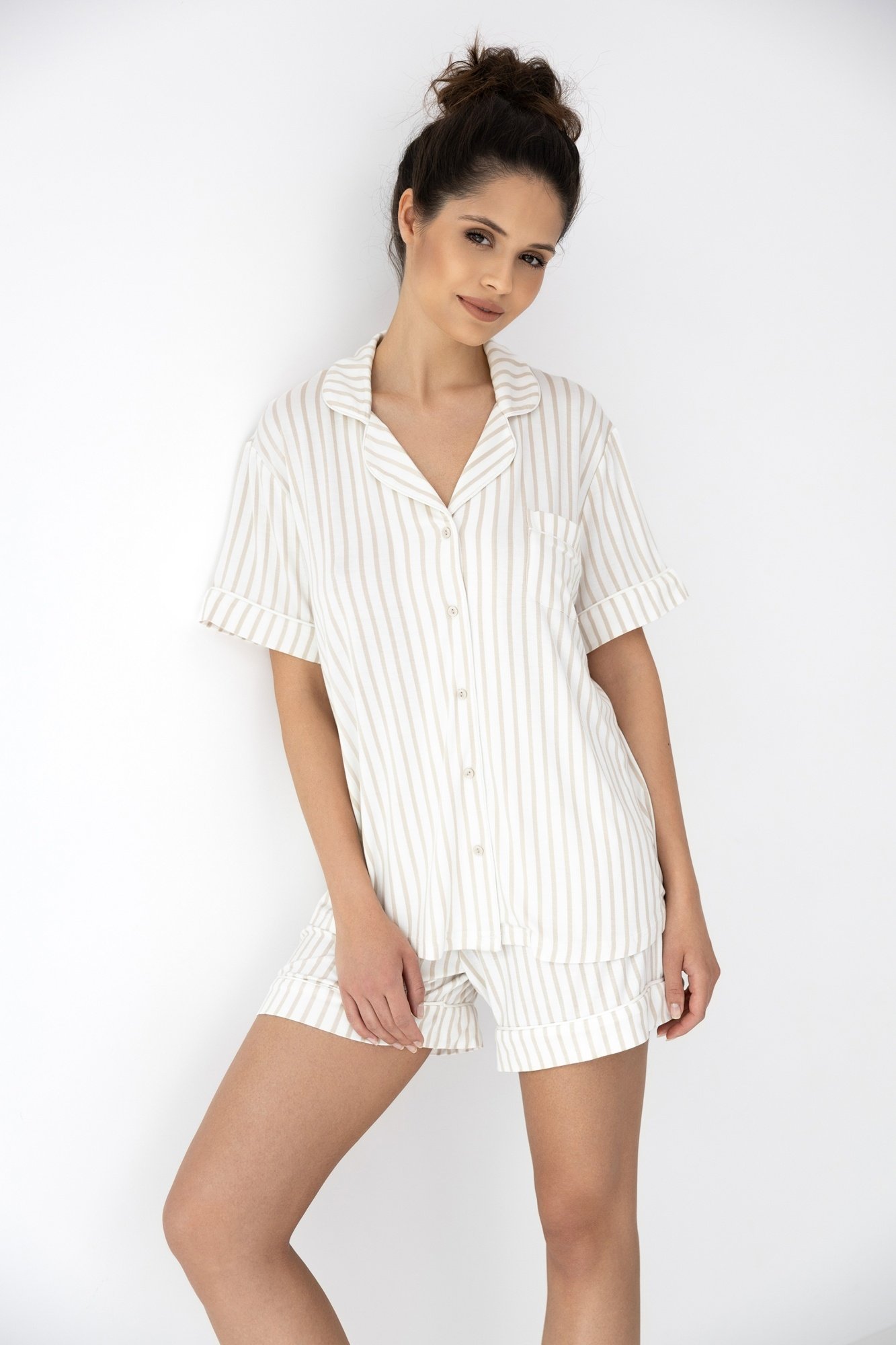 De Sensis Davina pyjama is een elegante en comfortabele dames shortama, uitgevoerd in een tijdloze streepprint. De set bestaat uit een klassiek pyjamashirt met knoopsluiting en een short met een losse, comfortabele pasvorm.