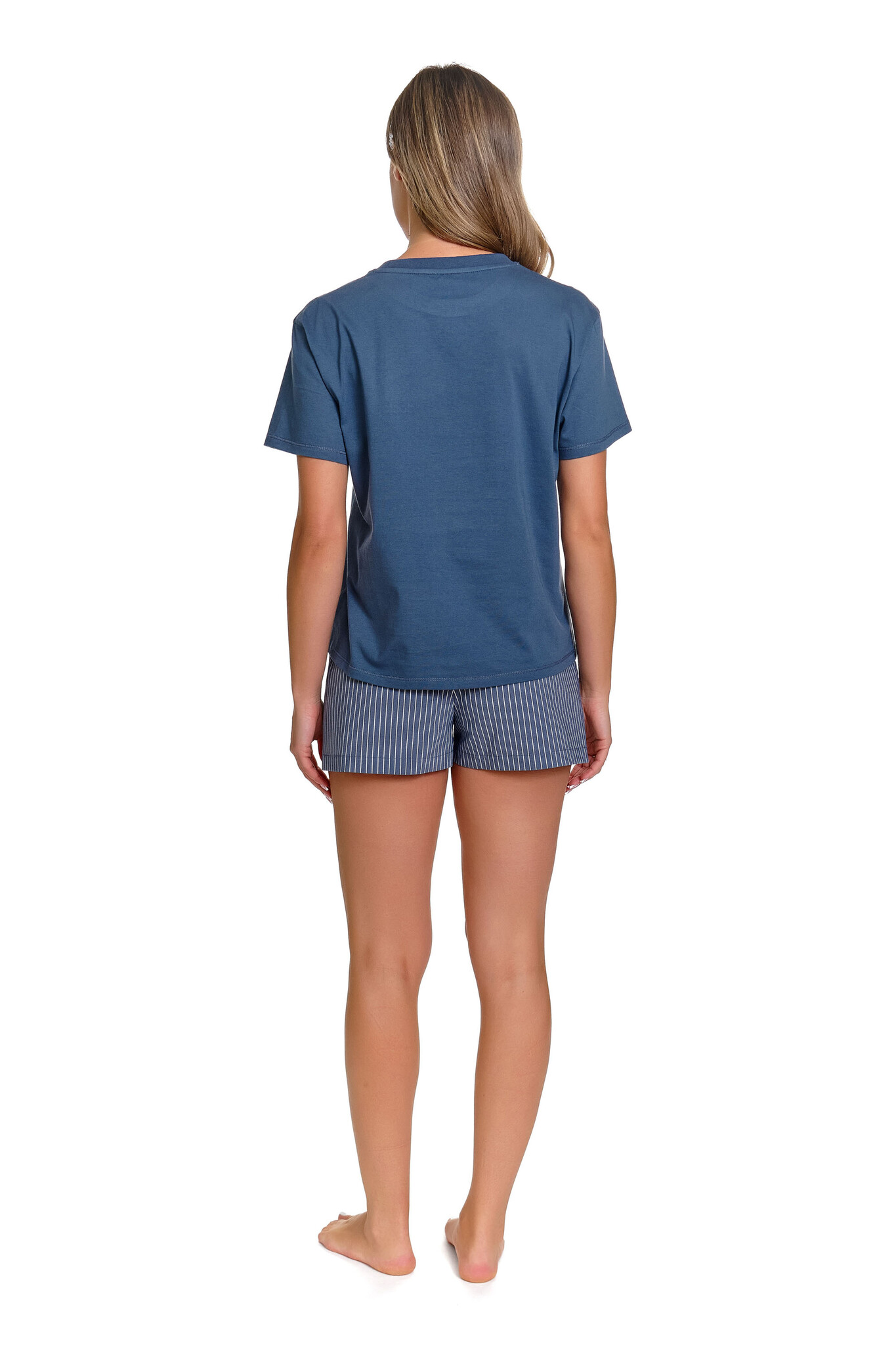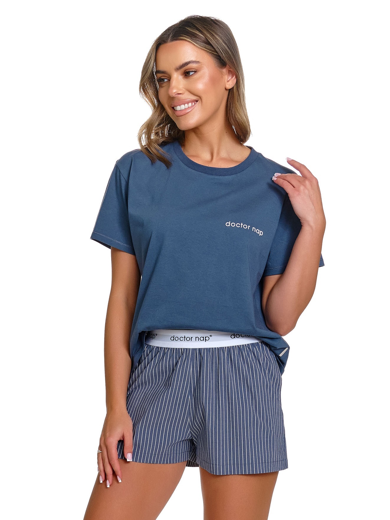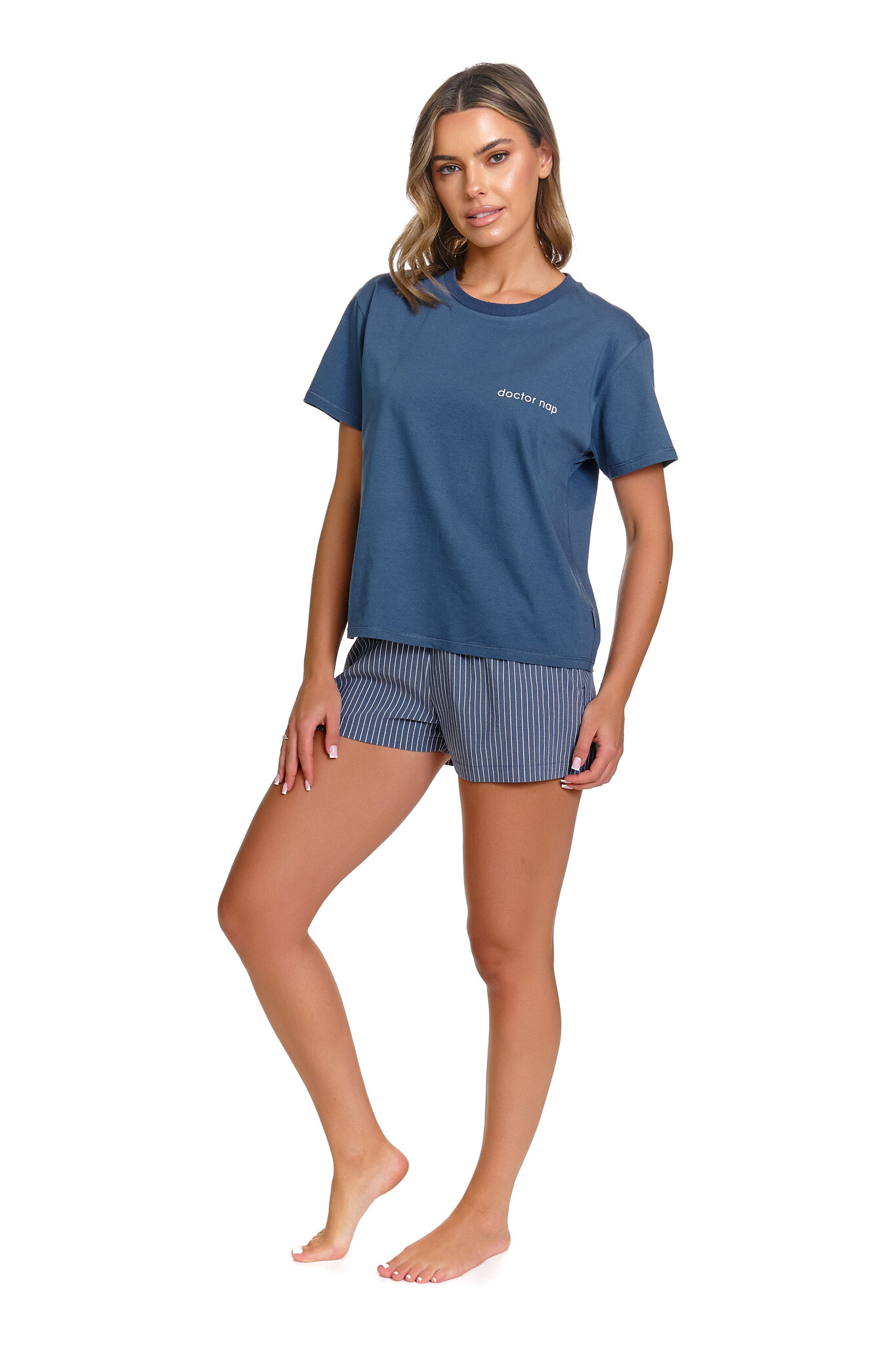 Deze pyjama set van Doctor Nap combineert een effen denim blue T-shirt met een sportief gestreepte short, voor een look die moeiteloos van bed naar bank gaat. Het zachte T-shirt valt losjes en comfortabel, terwijl de gestreepte short net dat beetje speels karakter toevoegt.