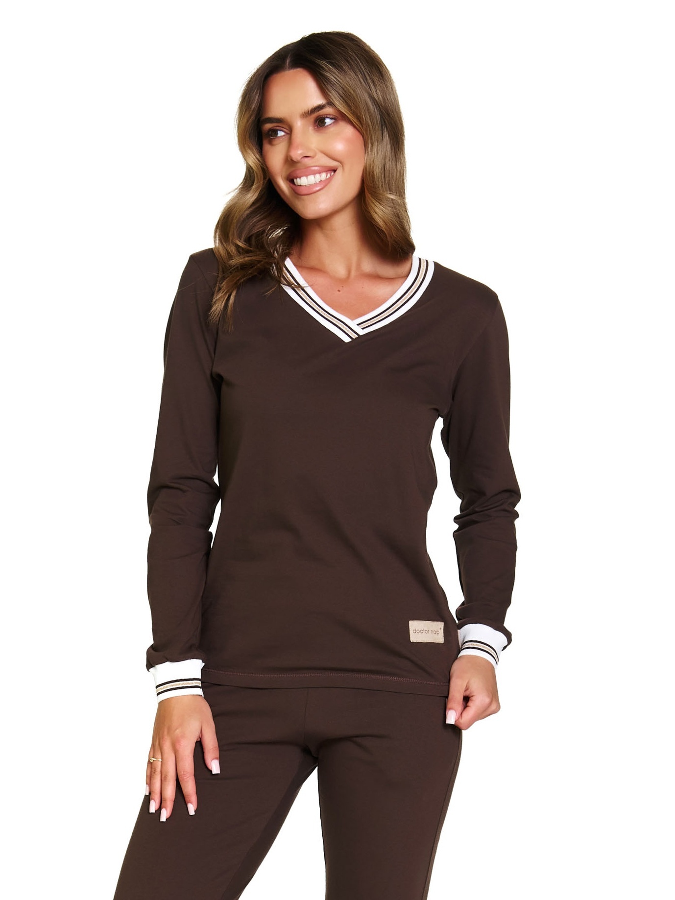 - Top: lange mouwen, V-hals en manchetten.