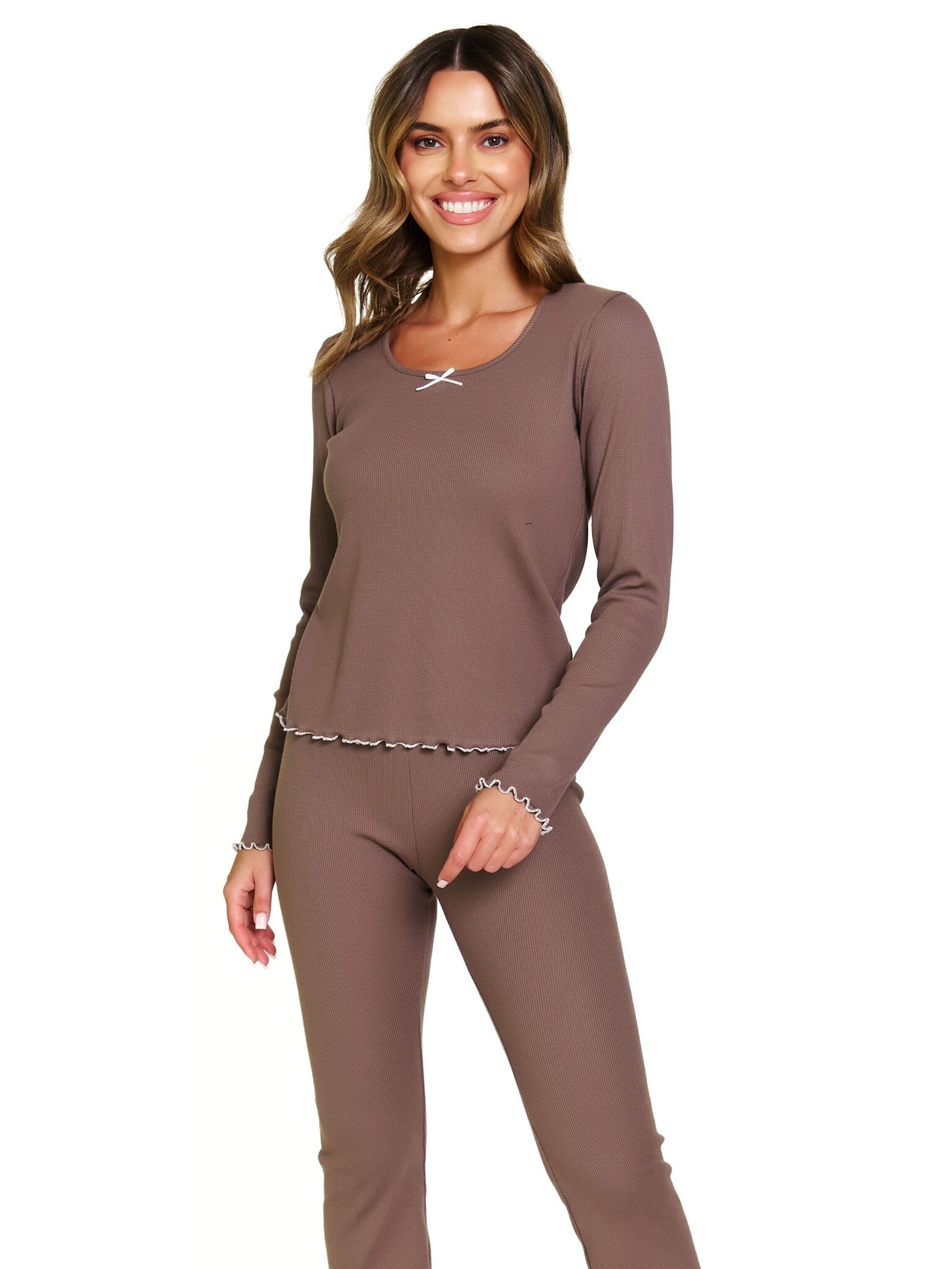 De set bestaat uit een comfortabele top en een broek met wijde pijpen – perfect voor een ontspannen ochtendkoffie op het terras of een gezellige filmavond op de bank.