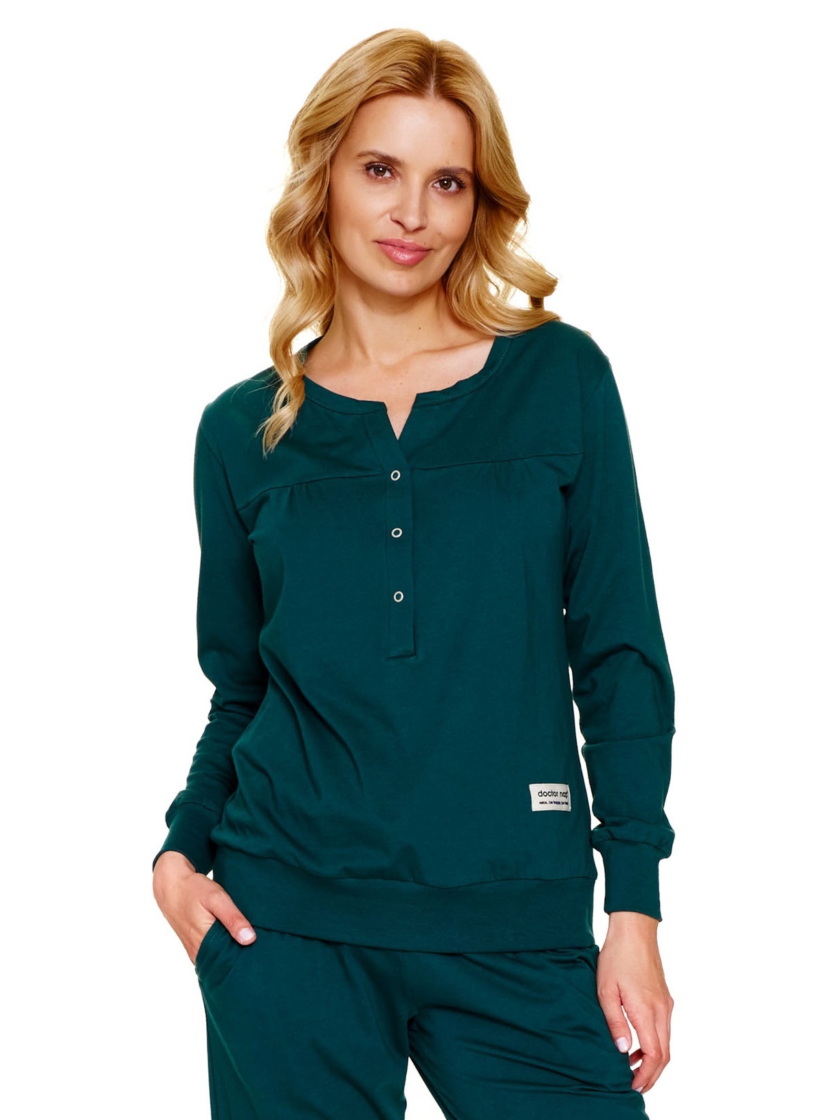 Deze comfortabele dames pyjama is ideaal voor dagelijks gebruik en koude nachten. De top heeft een effen design met drukknoopjes bij de hals, lange mouwen en manchetten. Dankzij de knoopjes is het model ook praktisch voor borstvoeding. De broek is effen, voorzien van zakken en afgewerkt met manchetten voor een goede pasvorm.