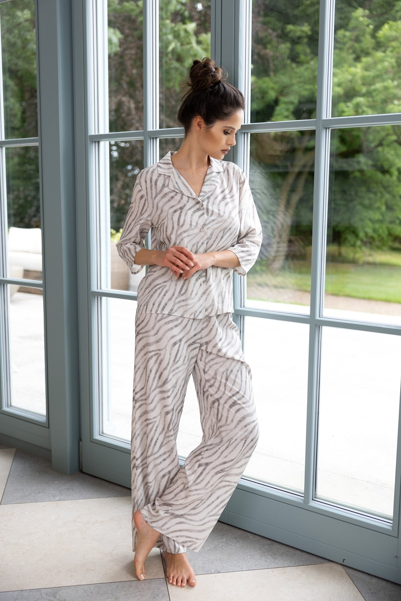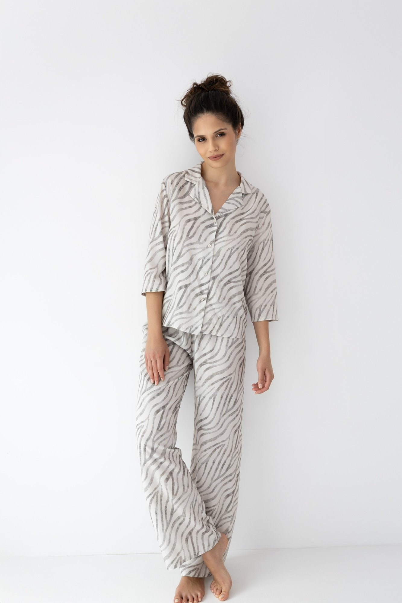 De Sensis Emory pyjama is een stijlvolle en comfortabele dames pyjamaset met lange broek, uitgevoerd in een elegante, subtiele print. De set bestaat uit een klassiek pyjamashirt met knoopsluiting, driekwart mouwen en een lange broek met een losse, rechte pasvorm.