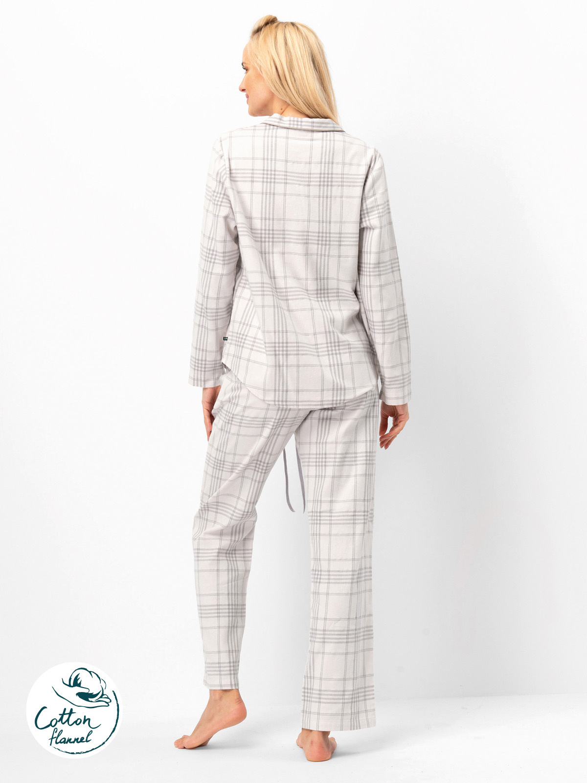 Rustige tinten van licht poederroze en grijs brengen jou en je lichaam helemaal tot rust. Een subtiel glinsterend zilverdraadje geeft de pyjama een uniek accent. Het warme flanellen materiaal houdt je heerlijk warm tijdens koele herfst- en winternachten.