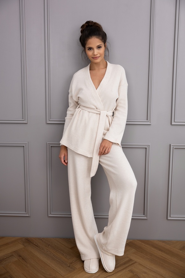Elegante dames pyjama of homewear set. Dikke, zachte gebreide stof in gebroken wit, met cardigan en losse broek