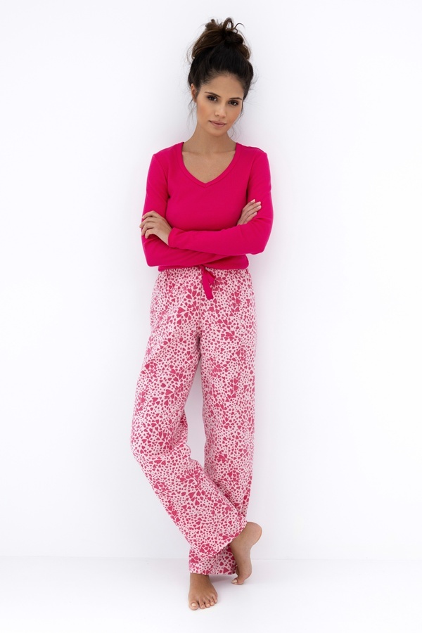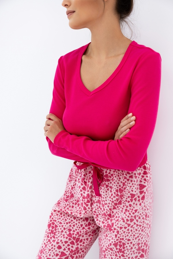 Dames pyjama van katoen en viscose. Geribde top met V-hals en zachte broek met hartjesprint.