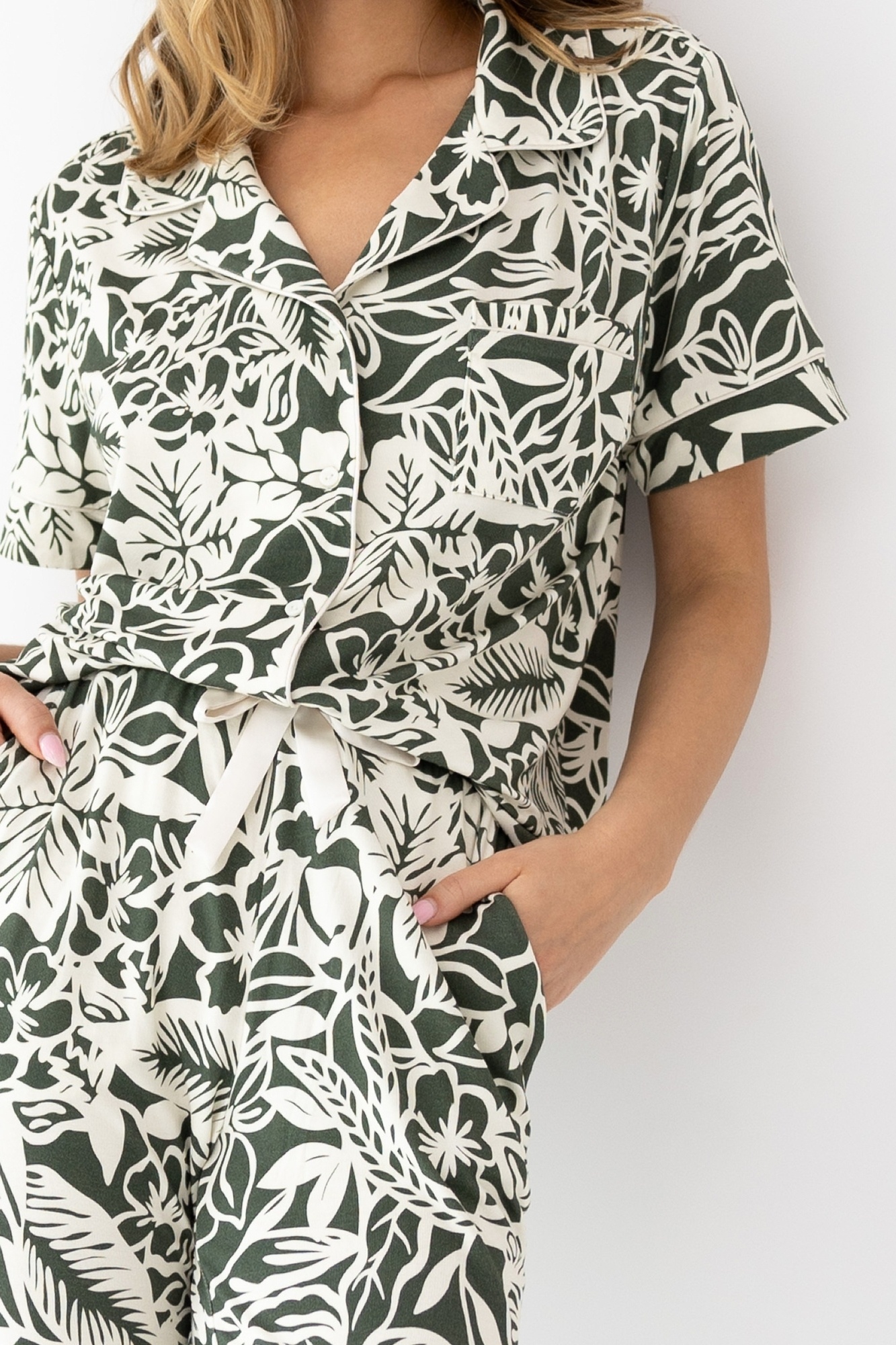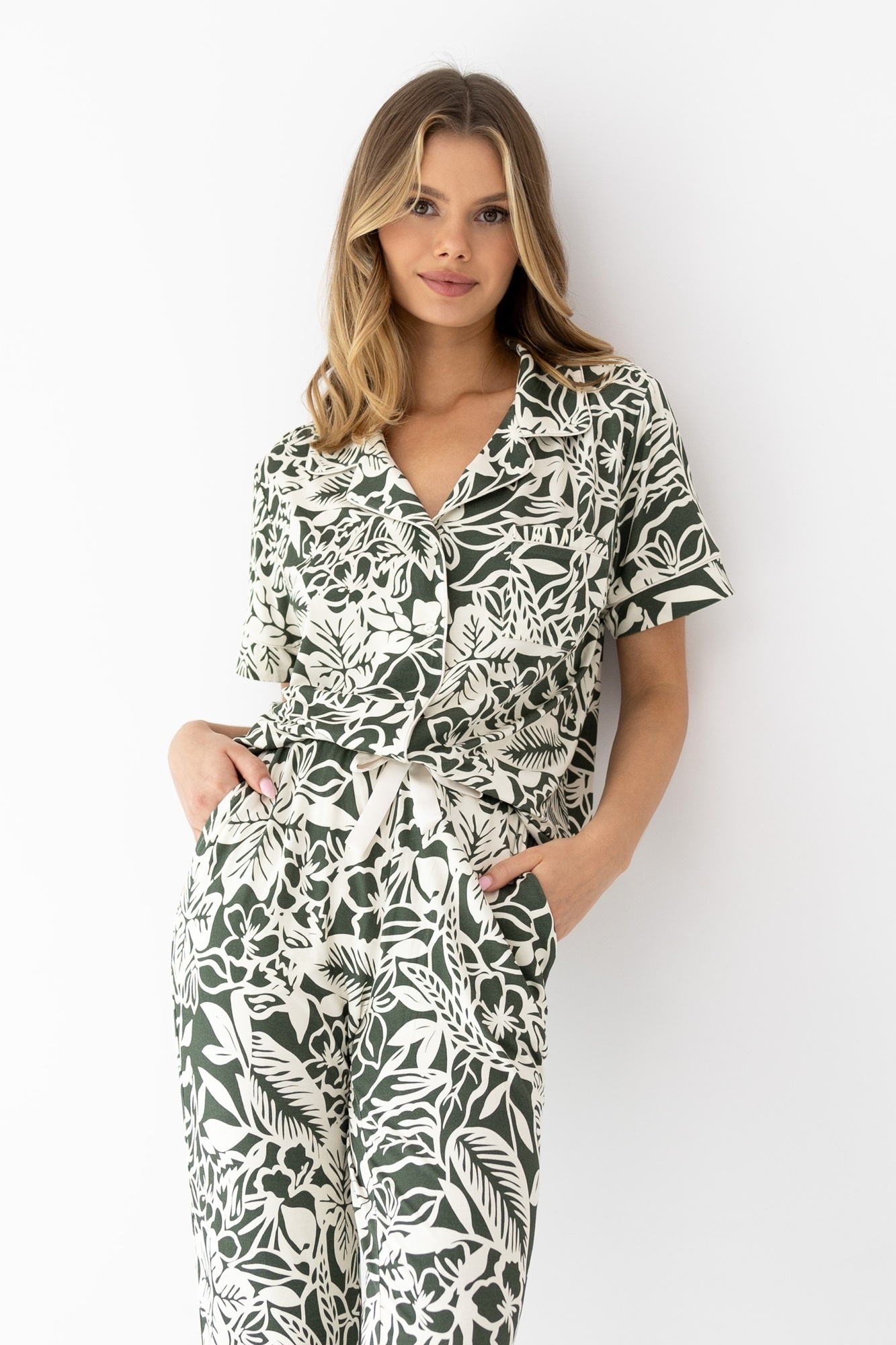 De Sensis Louise pyjama is een elegante en comfortabele dames pyjamaset met lange broek, uitgevoerd in een verfijnde all-over botanische print. De set bestaat uit een klassiek pyjamashirt met korte mouwen en een lange broek met een rechte, ontspannen pasvorm.