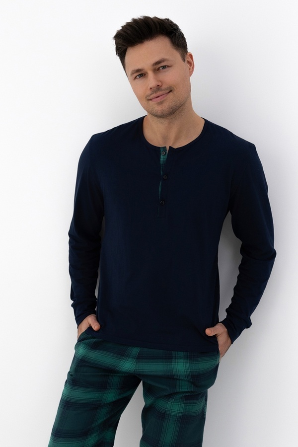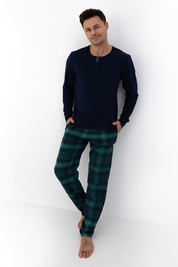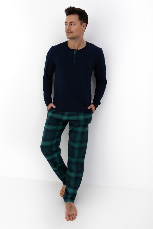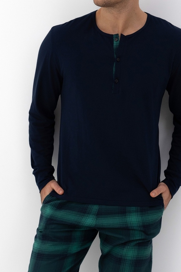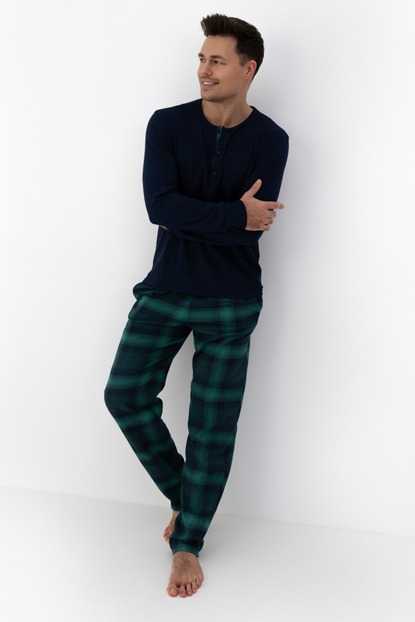 Deze comfortabele herenpyjama van hoogwaardig katoen biedt de perfecte combinatie van stijl en gemak. De donkerblauwe top met lange mouwen en ronde hals is afgewerkt met drie knoopjes voor een klassieke look. De lange broek in groen-blauwe ruit heeft een rechte snit, elastische tailleband en praktische zijzakken voor extra comfort. De zachte, ademende katoen zorgt voor een aangenaam gevoel op de huid en optimale bewegingsvrijheid – ideaal voor ontspanning of een goede nachtrust. Perfect als cadeau of te combineren met de damespyjama Cassandra voor een stijlvolle set voor koppels.