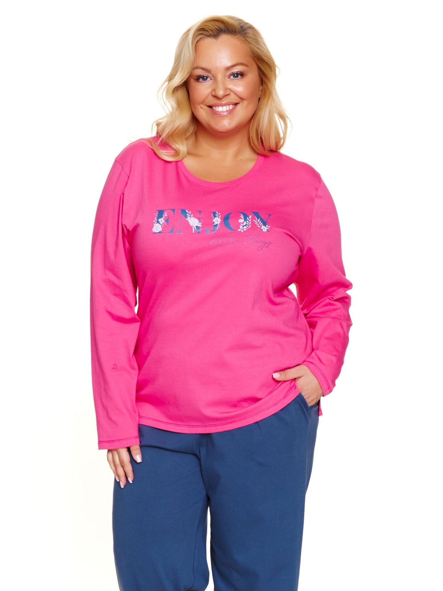 Deze unieke pyjama in plus size is speciaal ontworpen voor vrouwen die comfort, een vrouwelijke stijl en een positieve uitstraling waarderen. Het shirt met lange mouwen in een levendige roze tint, voorzien van de inspirerende tekst “ENJOY little things”, brengt charme én motivatie. De effen donkerblauwe broek zorgt voor ultiem draaggemak en volledige bewegingsvrijheid.