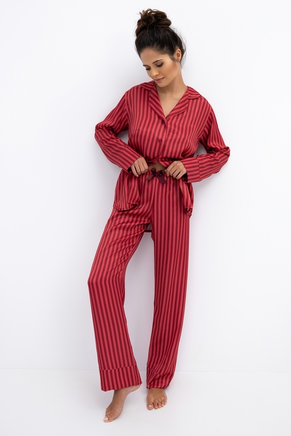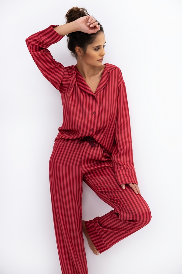 Deze elegante damespyjama is gemaakt van hoogwaardige viscose met een subtiele satijnachtige glans. De top heeft een klassieke overhemdsnit met kraag, volledige knoopsluiting en verfijnde stiksels op de manchetten voor een luxe uitstraling. De losse broek valt soepel langs het lichaam en is afgewerkt met een sierlijke strik en dezelfde elegante stiksels aan de onderkant van de pijpen. Dankzij de ademende en huidvriendelijke viscose voelt deze pyjama zacht en comfortabel aan, ideaal voor wie stijl en comfort wil combineren tijdens het slapen of ontspannen thuis.