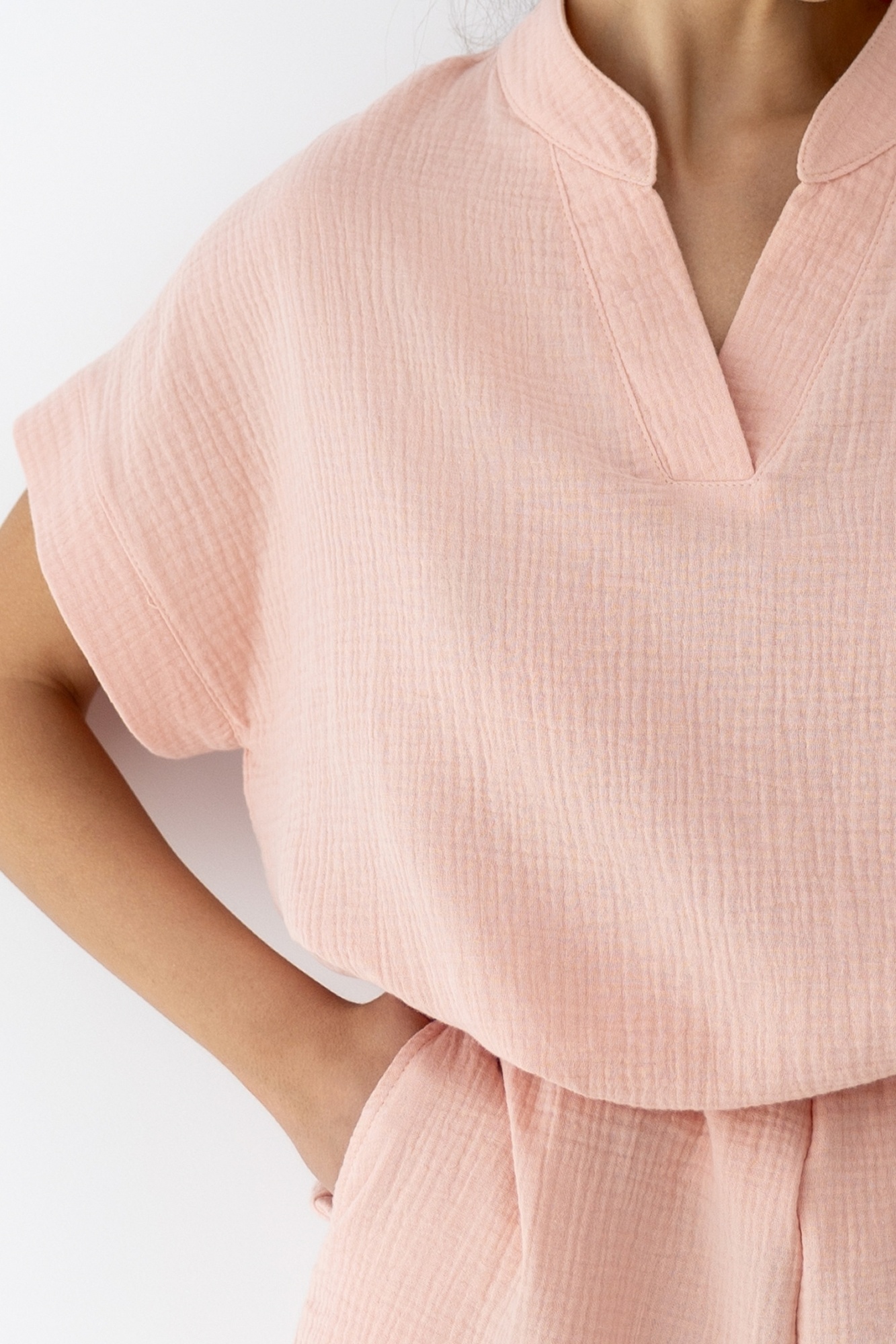 In zalm roze — een warme, zachte kleur die de delicate mousseline stof prachtig tot zijn recht laat komen. Een pyjama die je graag de hele dag aanhoudt.
