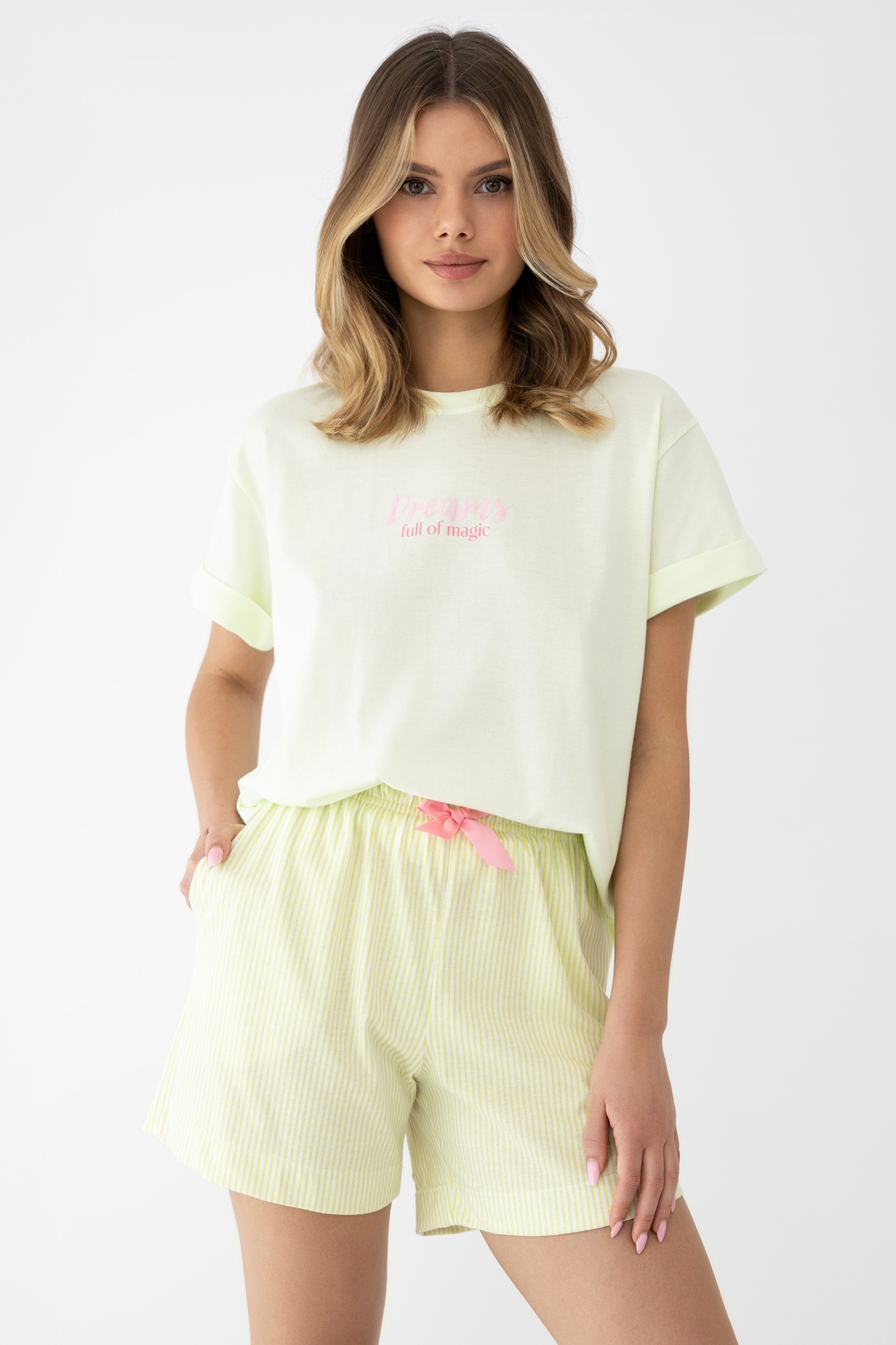 Katoenen shortama / pyjama met "Dreams full of magic" print top en gestreepte shorts met roze strikje – vrolijk, zacht en gemaakt in de EU.