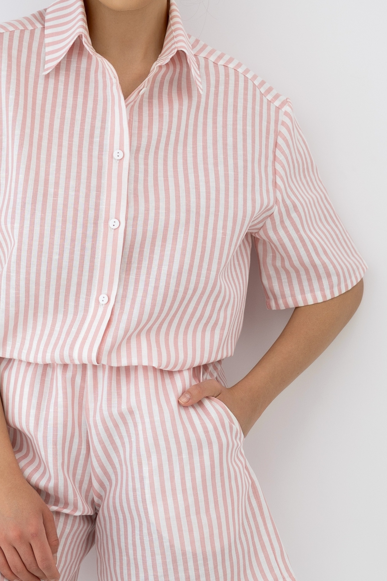 De stof van 55% linnen en 45% katoen combineert het beste van twee hoogwaardige natuurlijke materialen. Linnen staat bekend om zijn uitstekende ademend vermogen en verkoelende eigenschappen, terwijl katoen zorgt voor extra zachtheid en draagcomfort. Samen creëren ze een lichte, duurzame en huidvriendelijke stof die perfect is voor de zomer.