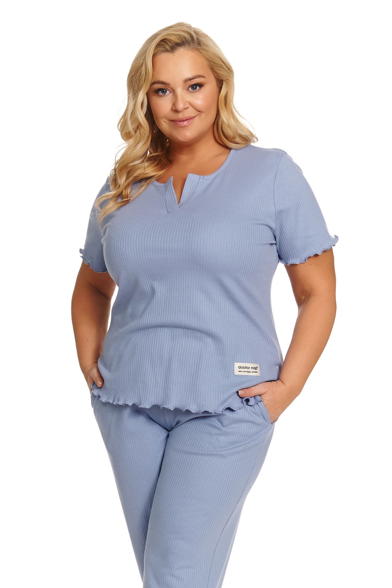 Katoenen pyjama plus size met korte mouw en 3/4 broek – zachte ribstof voor een comfortabele nacht en ontspannen thuismomenten.