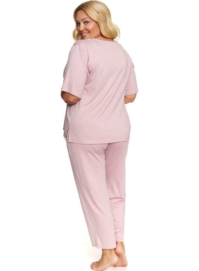 Ontdek deze elegante plus size pyjama die stijl en comfort perfect combineert. Gemaakt van zachte viscose, is deze pyjama ontworpen om je elke nacht te laten genieten van ultiem draagcomfort. De top met korte mouwen is versierd met verfijnde witte kant rond de v-hals, wat een vrouwelijke en luxe uitstraling geeft. De brede 7/8 broek met handige zakken zorgt voor extra bewegingsvrijheid en comfort, ideaal voor ontspannen momenten thuis.
