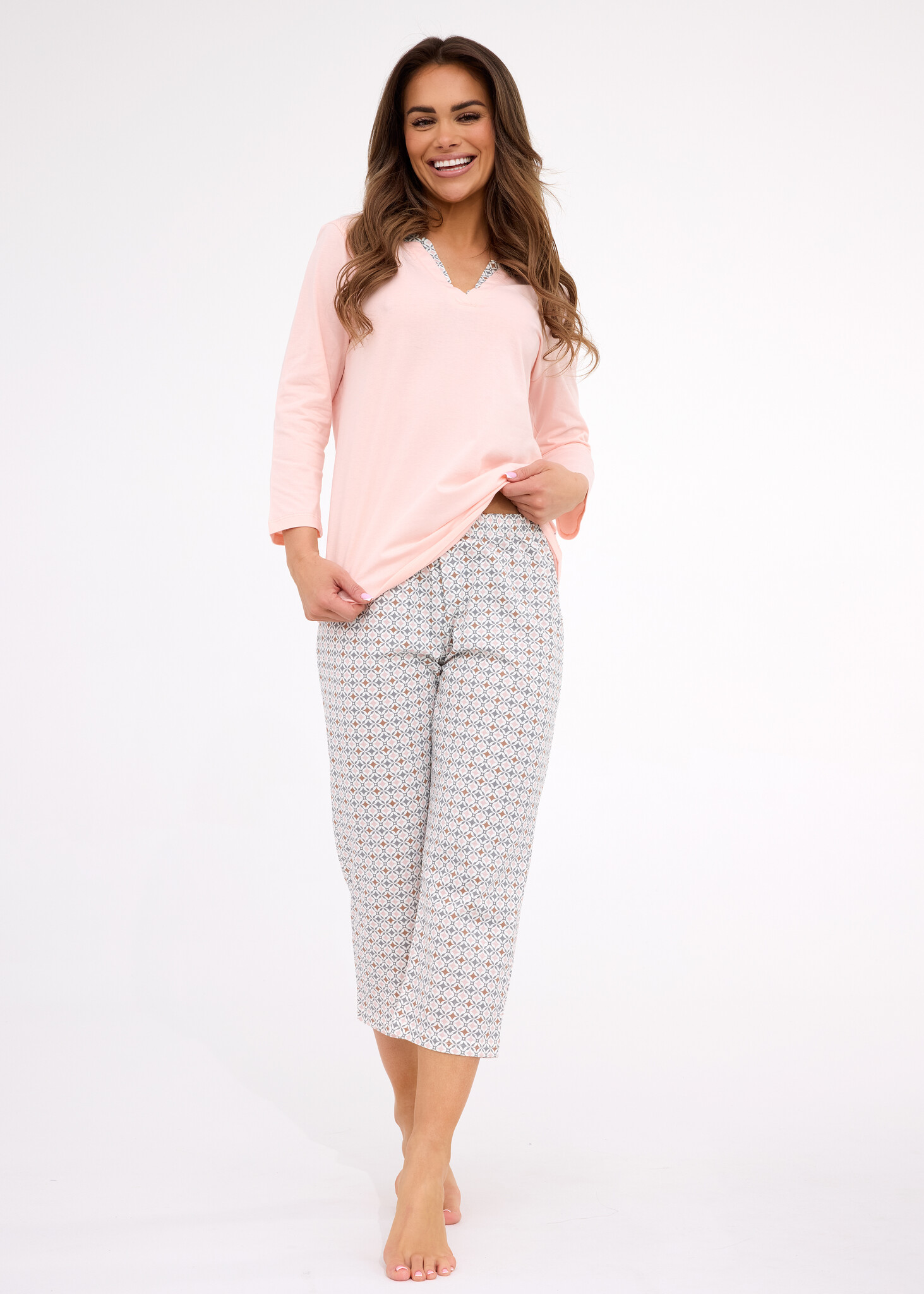 Deze zachte dames pyjama in lichtroze tinten is ideaal voor wie houdt van comfortabel en vrouwelijk nachtkleding. De top heeft 7/8 mouwen, een V-hals en een contrasterende bies die het ontwerp een subtiele finishing touch geeft. De 3/4 broek is uitgevoerd in een speelse print in wit, grijs, beige en roze en biedt veel bewegingsvrijheid tijdens het slapen of ontspannen.