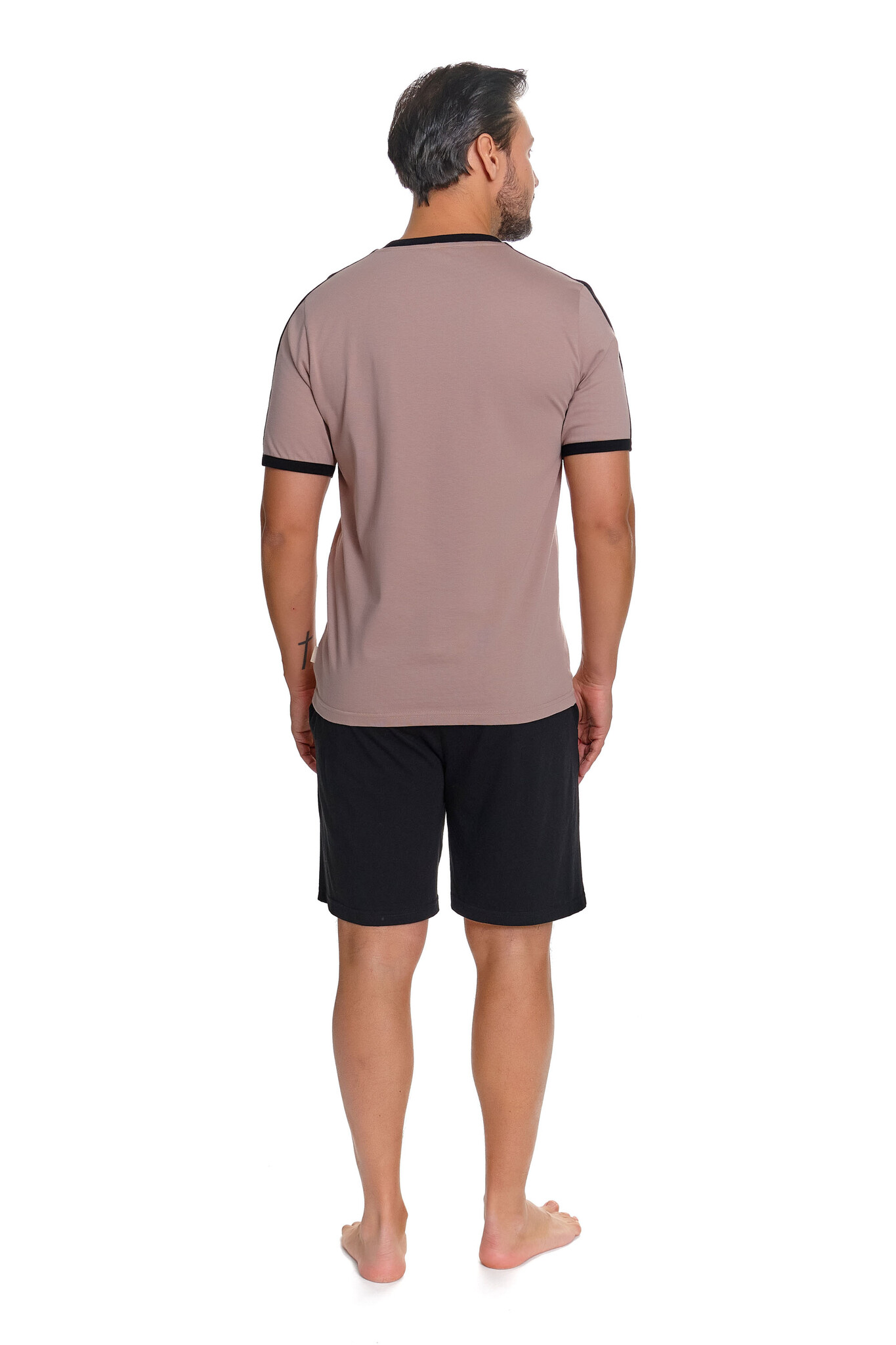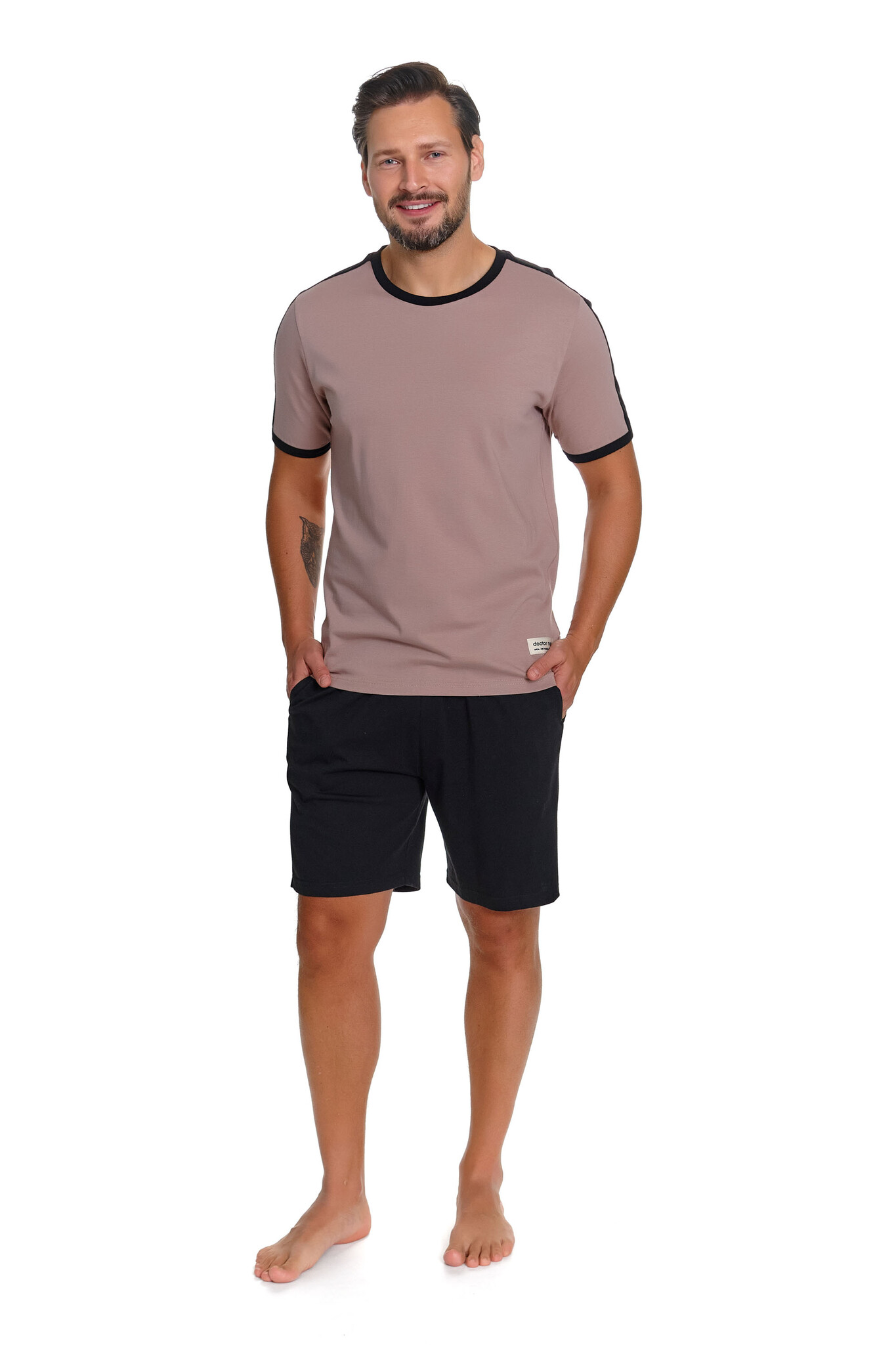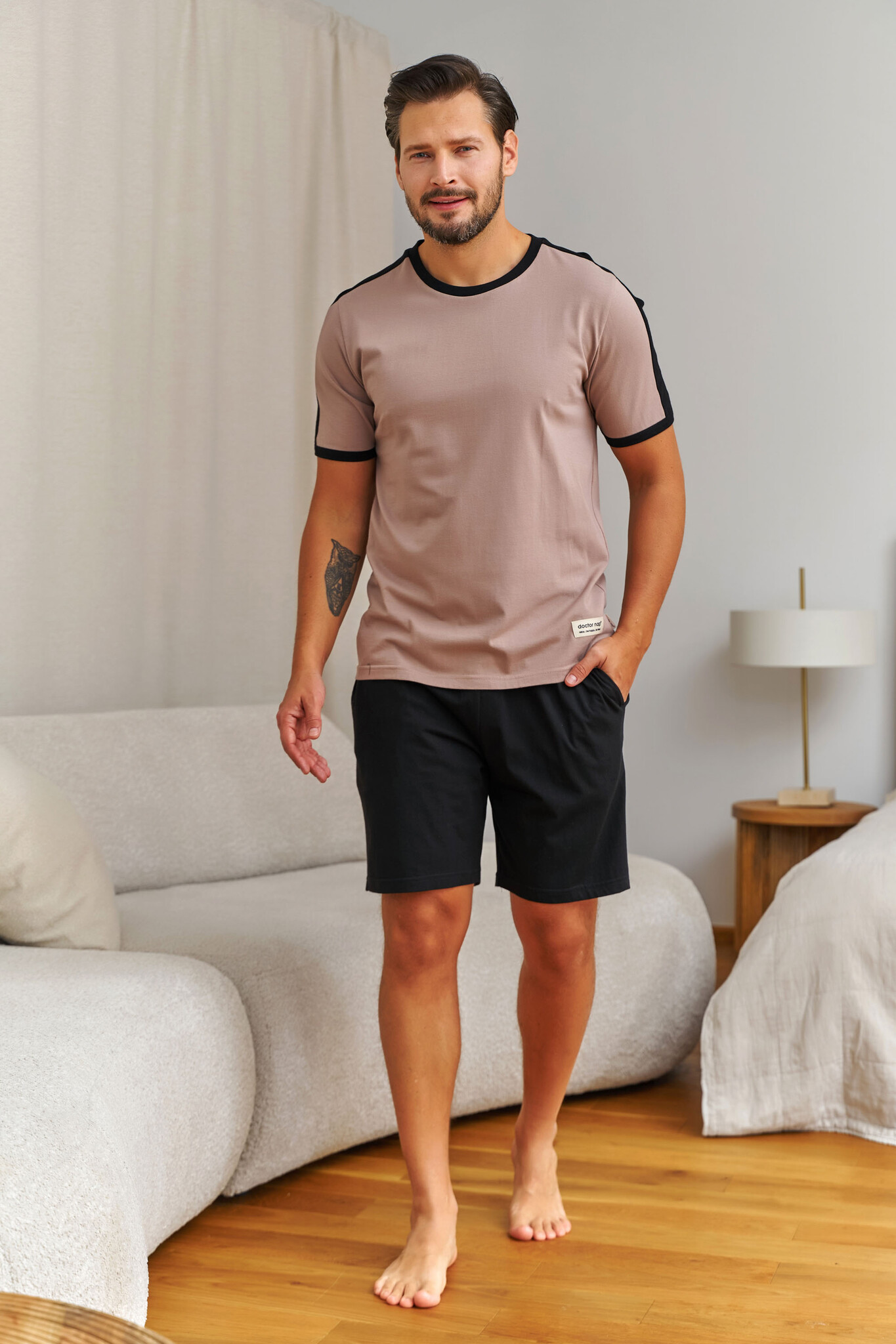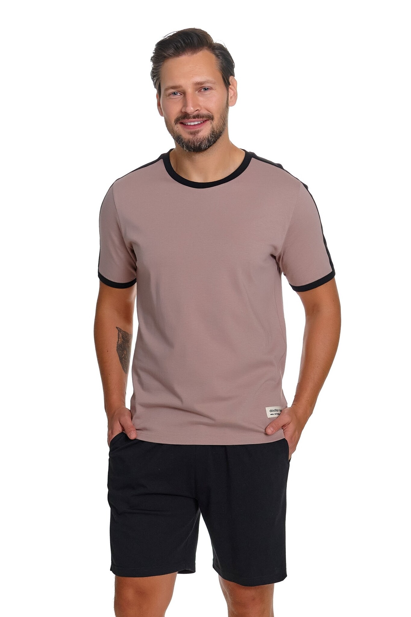 Deze pyjama set van Doctor Nap speelt met kleurcontrast op een subtiele manier: het warme beige T-shirt krijgt karakter door de strakke zwarte ribboorden bij de ronde hals en de mouwen. Het resultaat is een sportief-minimalistische look die er verzorgd uitziet, ook thuis.