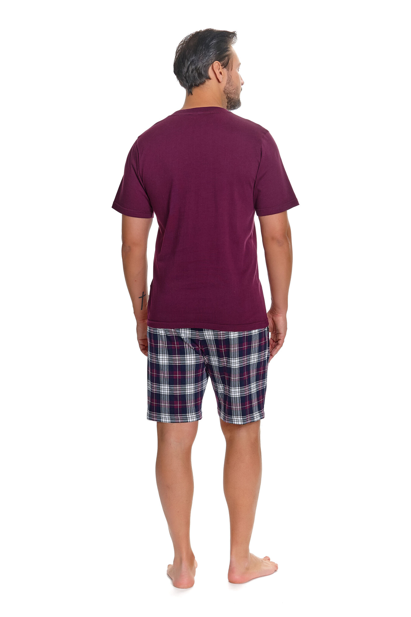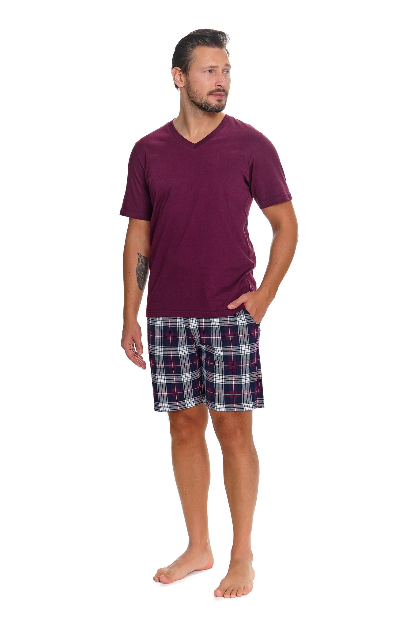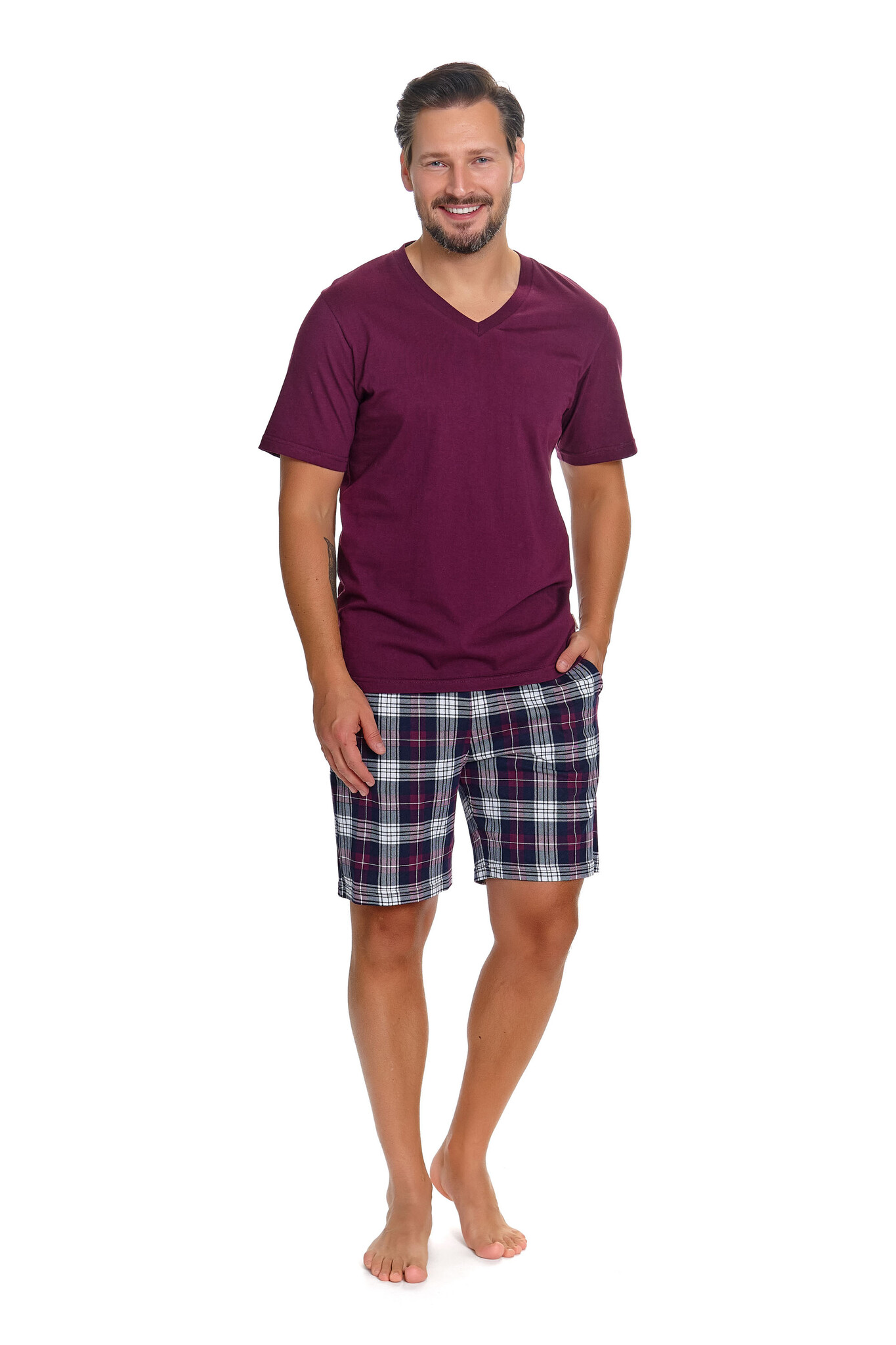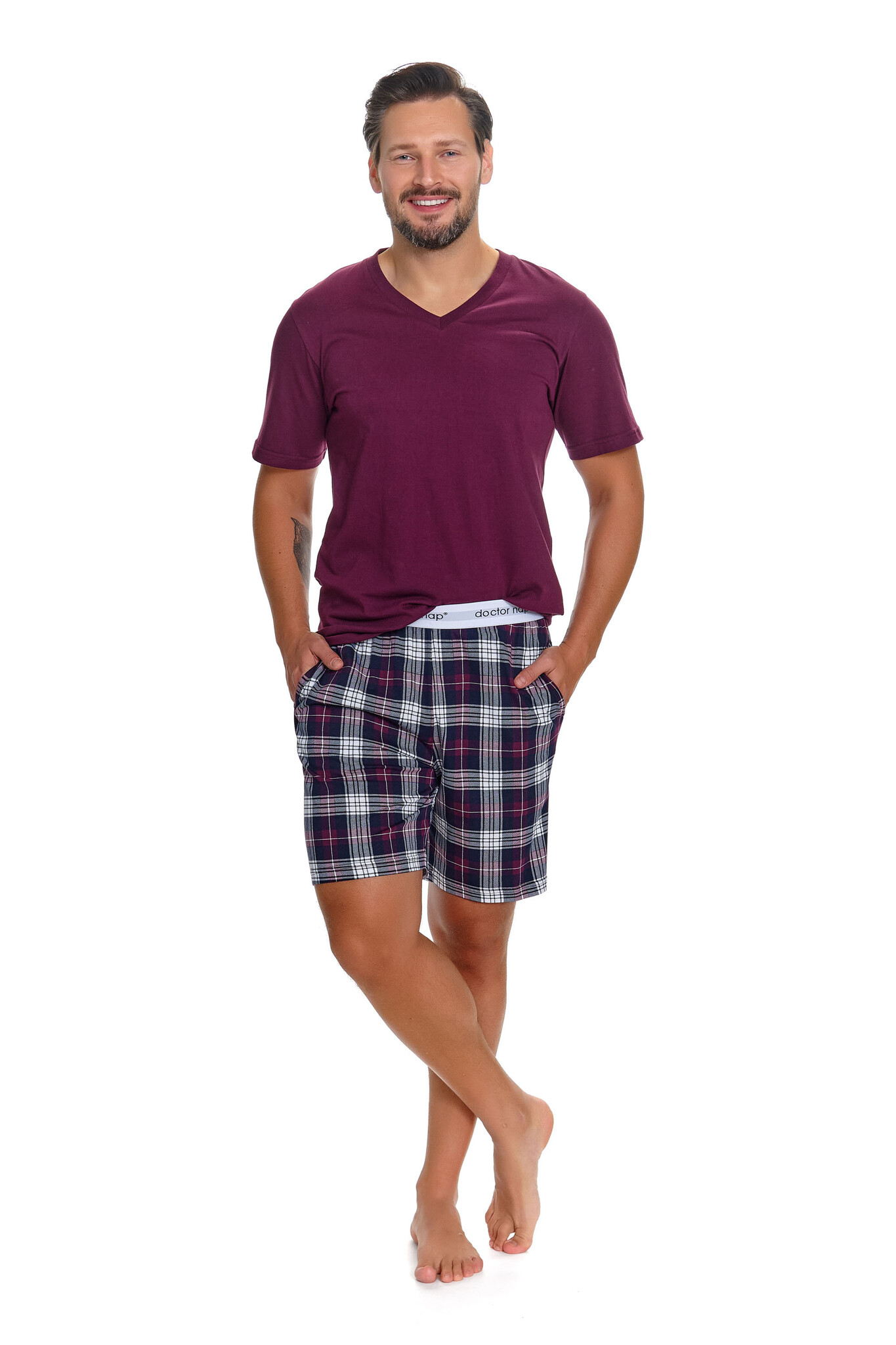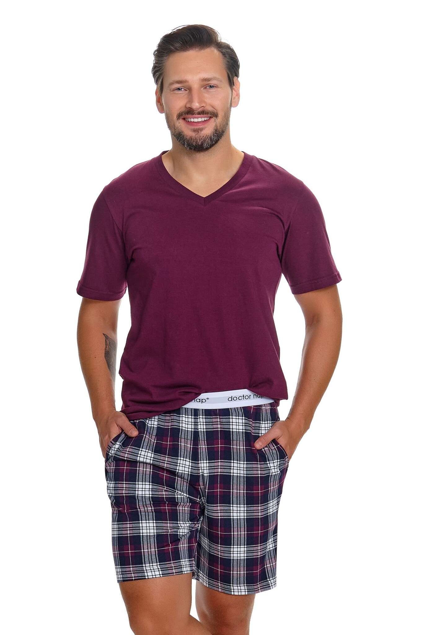 Deze pyjama set van Doctor Nap combineert een effen bordeauxrood T-shirt met een geruite short in donkerblauw, bordeaux en wit — een tijdloze combinatie die er verzorgd uitziet zonder moeite. De V-hals geeft het T-shirt een klassieke uitstraling en legt de basis voor een volwassen, stijlvol ensemble.