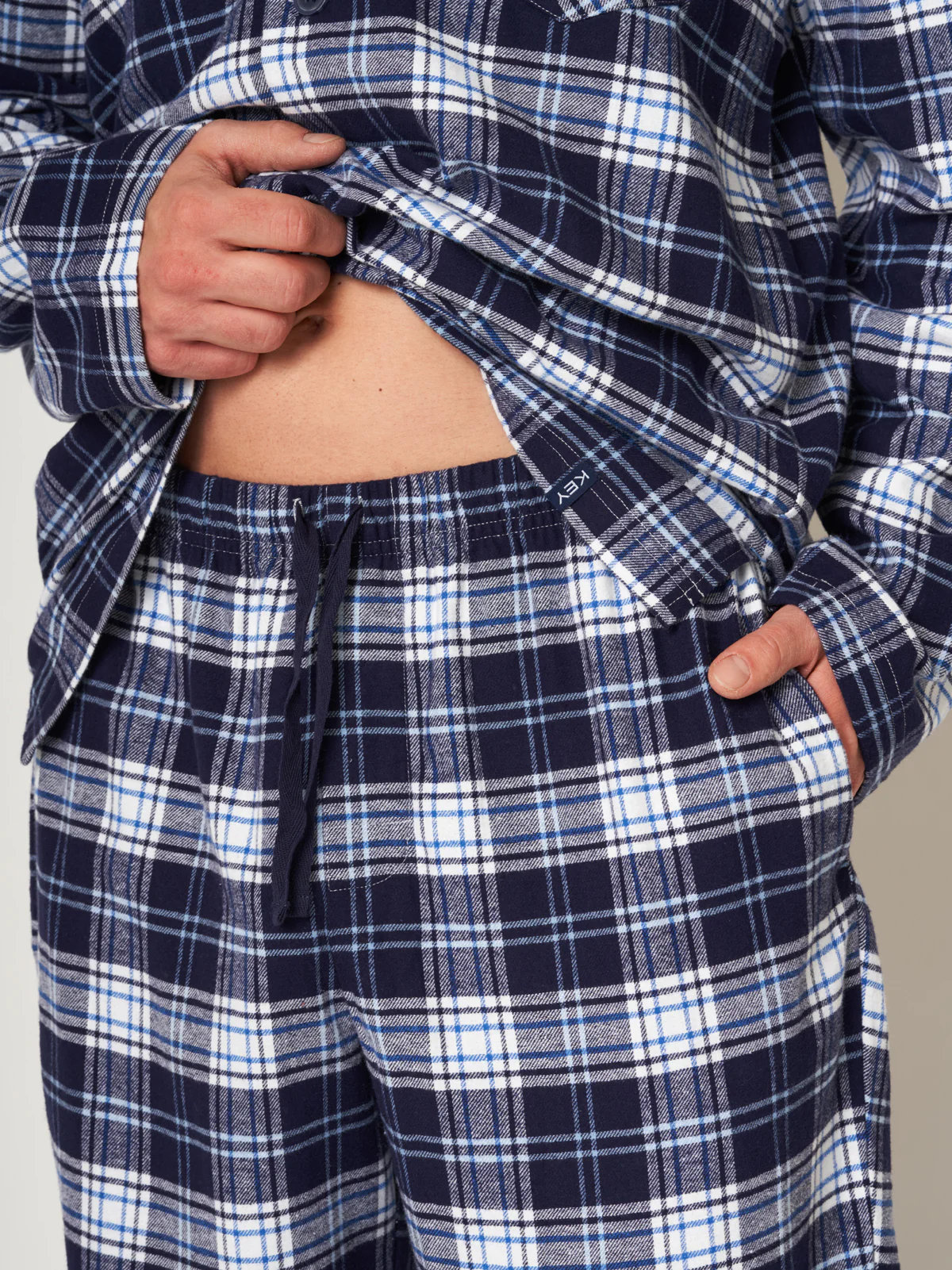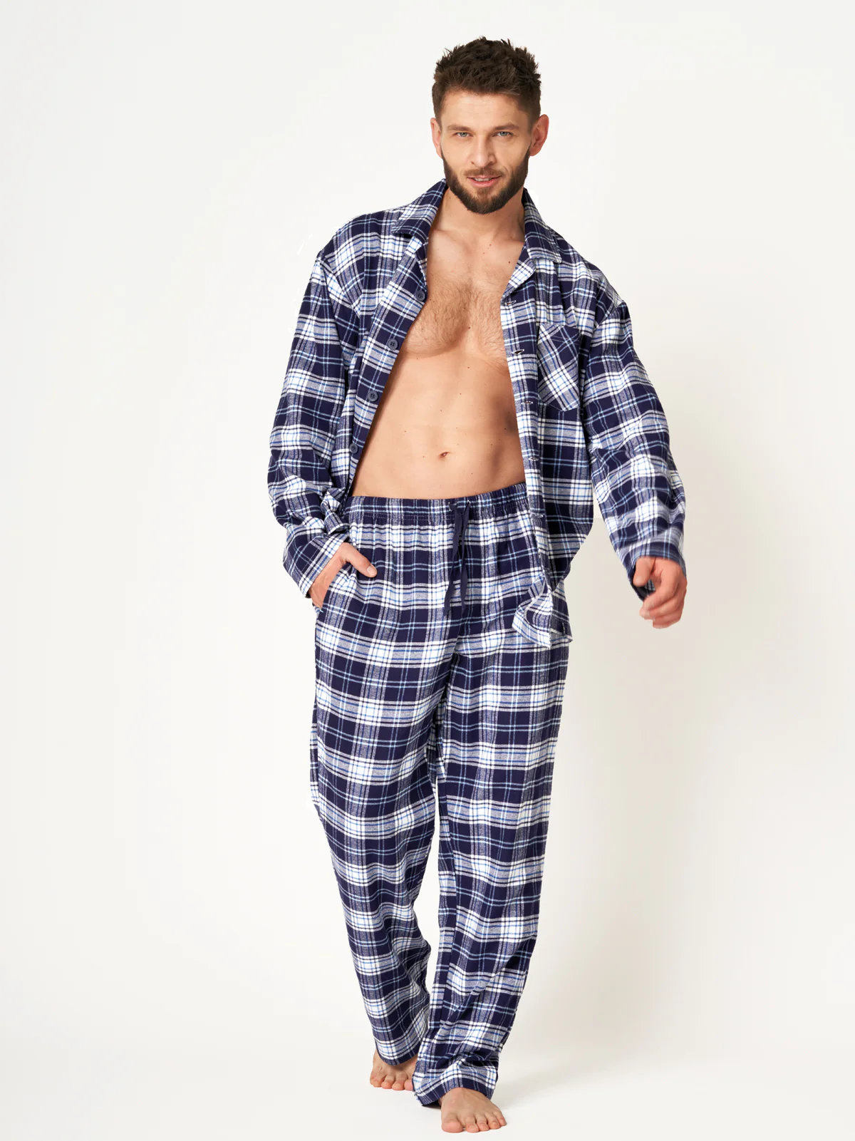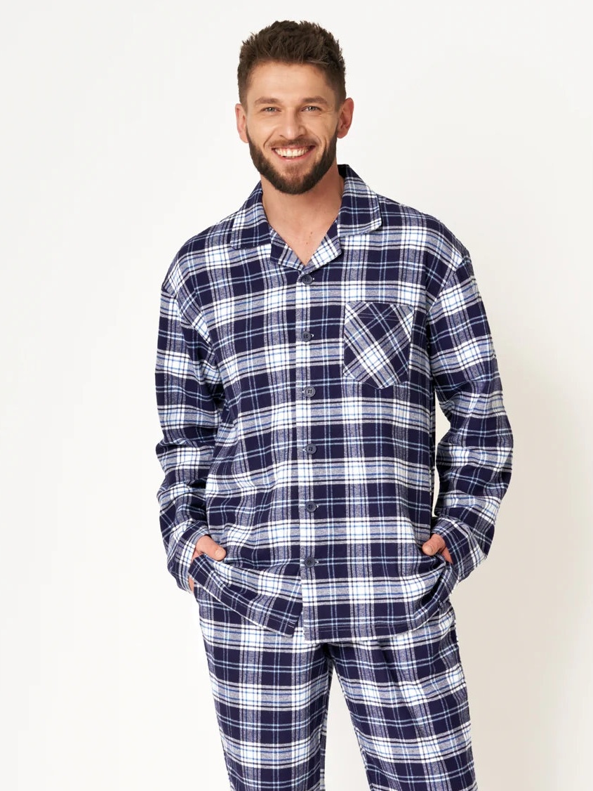 Deze klassieke heren pyjama in elegante tinten van blauw en wit biedt ultiem comfort tijdens koude winternachten. De tijdloze combinatie van een fijn ruitpatroon en de zachte, warme flanellen stof maakt dit een must-have voor elke man die houdt van comfort en stijl. Gemaakt van 100% hoogwaardige katoenen flanel, voelt deze pyjama heerlijk aan op de huid en biedt langdurige warmte.