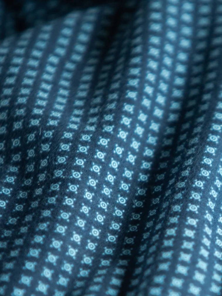 Het stijlvolle patroon in tinten marineblauw en lichtblauw geeft een harmonieuze en moderne uitstraling. Het dessin is op de stof gedrukt, waardoor de structuur stevig en compact blijft. Een perfect cadeau voor een dierbare man, verpakt in een mooie, decoratieve doos!