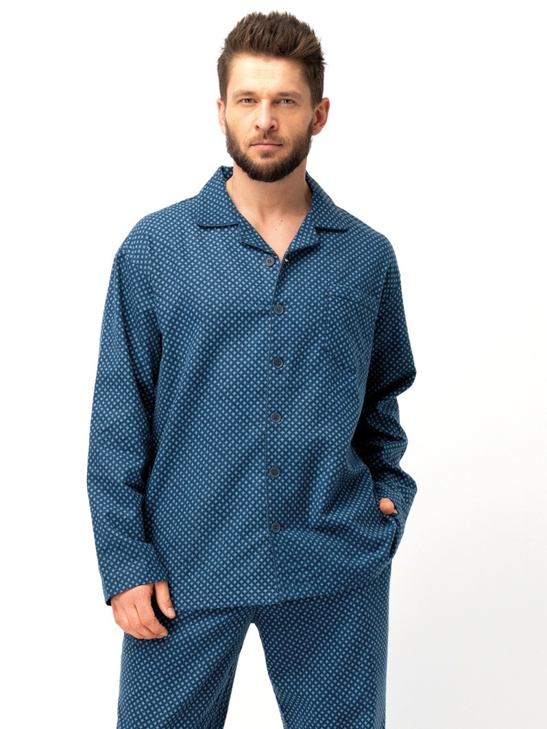 Het klassieke overhemd heeft een knoopsluiting tot aan de hals en lange mouwen die comfortabel zijn afgewerkt met een eenvoudige zoom. De broek heeft een zachte elastische tailleband en handige zakken – een al jarenlang beproefd model. Rechte pijpen zorgen voor optimale bewegingsvrijheid tijdens een herstellende slaap.