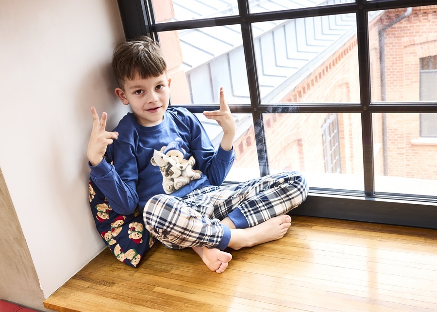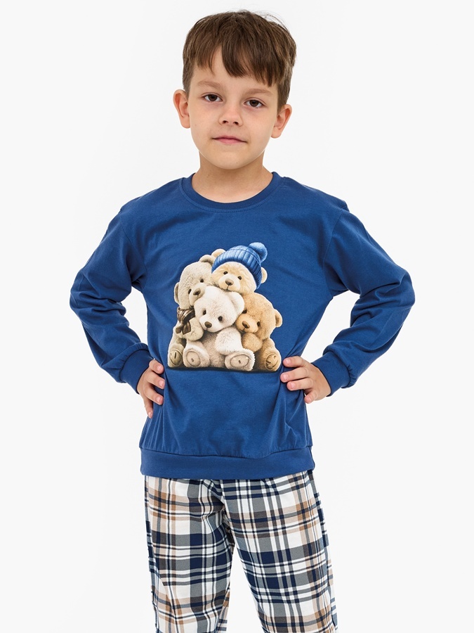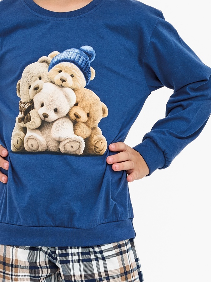 Deze gezellige pyjama voor jongens is onderdeel van onze populaire familiecollectie en is nu verkrijgbaar in een nieuwe, leuke uitvoering. De blauwe top met schattige berenprint en comfortabele boorden zorgt voor een warme, winterse look. De lange broek met blauwwit-beige ruit en contrasterende manchetten maakt de set compleet. Ideaal voor knusse avonden, kerstfoto’s of ontspannen ochtendmomenten met het gezin. Een perfect cadeau-idee voor de feestdagen!