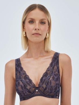 Deze betoverende bralette uit de Glow-collectie is uitgevoerd in diep donkerblauw en gemaakt van glanzend kant met een lineair-bloemenmotief, gecombineerd met sierlijke tule. De kant loopt elegant door over het decolleté en de schouders. Verstelbare details in roségoud accentueren de glinsterende draad in de kant en geven het ontwerp een unieke, luxueuze uitstraling.